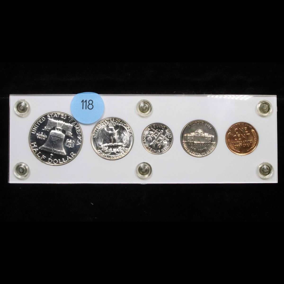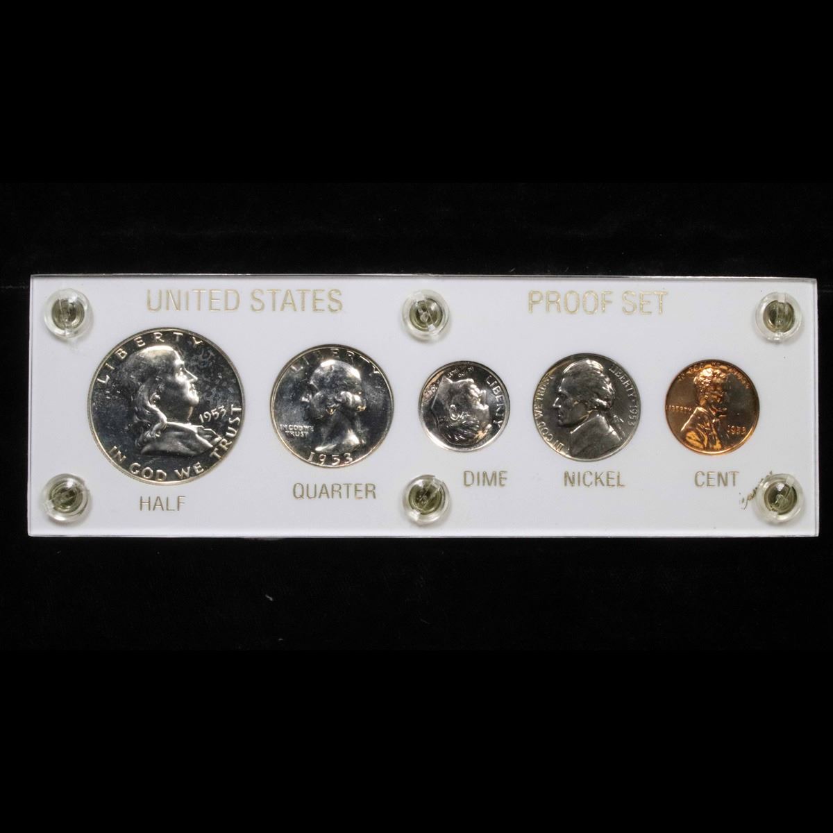 1953 United States Proof Set in Capital Plastic Holder. This set, has a 90% Proof Silver Franklin Half Dollar, a 90% Proof Silver Quarter, a 90% Proof Silver Dime, plus the proof nickel and proof penny.All encased in a Capital Plastic Holder.