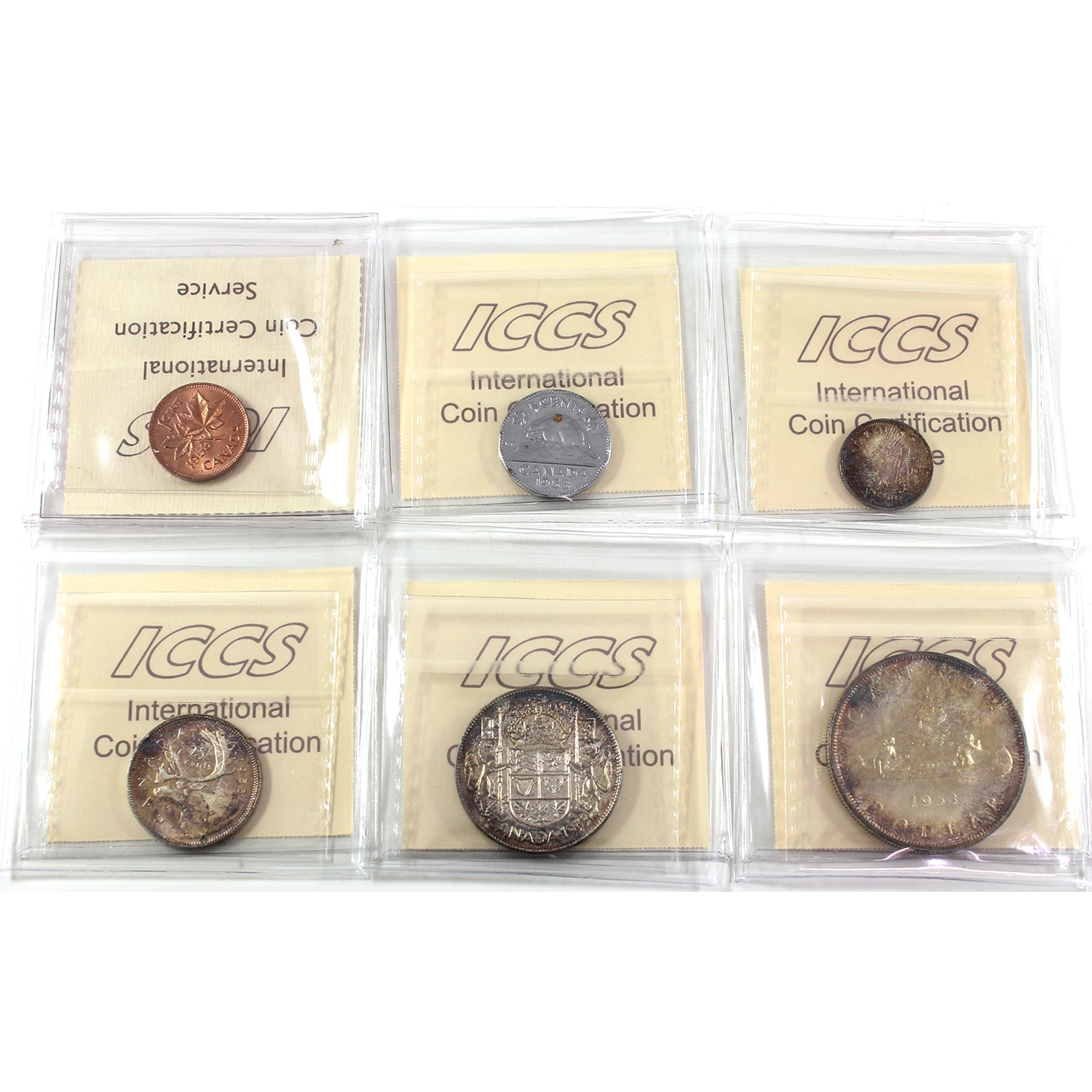 INCLUDES: 1-cent NSF MS65 Red, 5-cent NSF FL MS65, 10-cent NSF MS66, 25-cent Small Date MS65 Cameo, 50-cent Small Date MS64, & $1 Silver SF MS64. 6pcs.