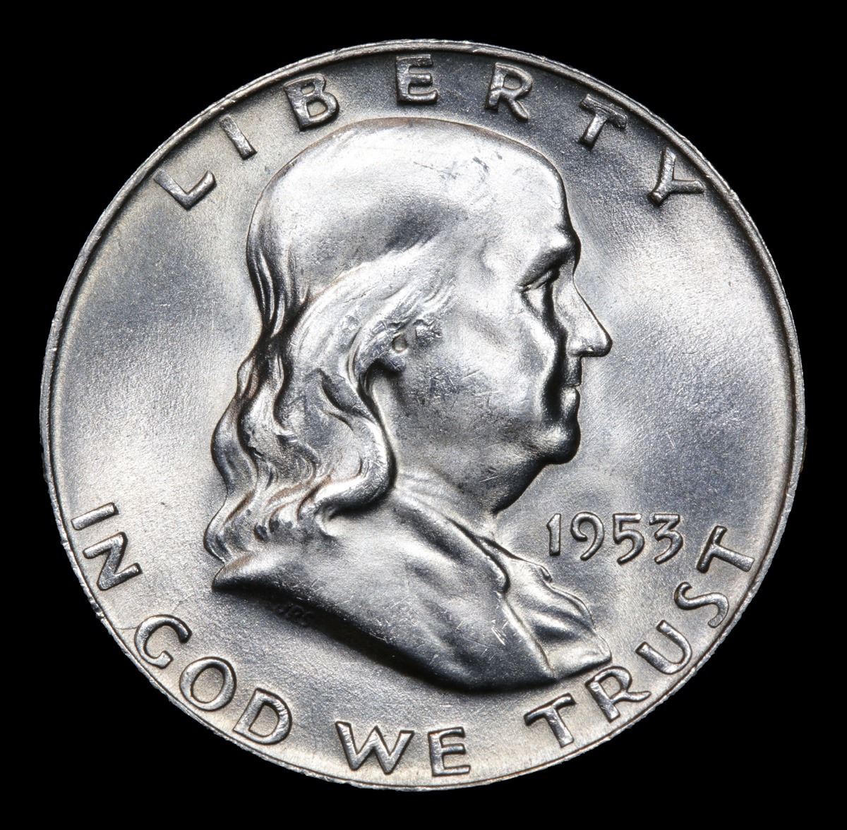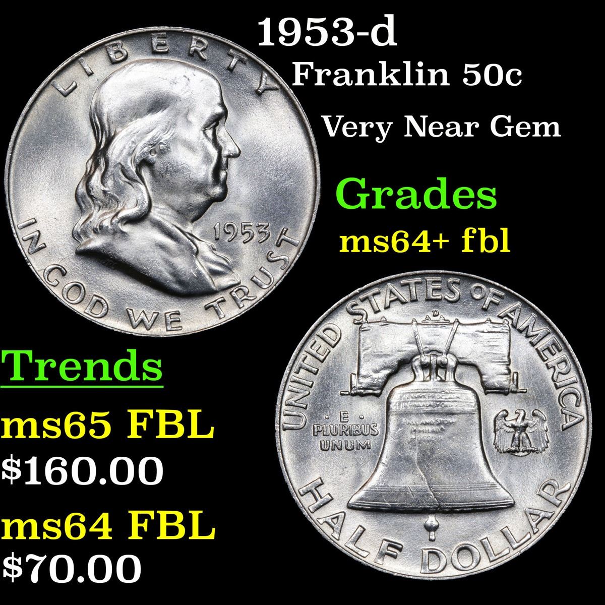 1953-d . Very Near Gem Franklin Half Dollar 50c Grades Choice Unc+ FBL.