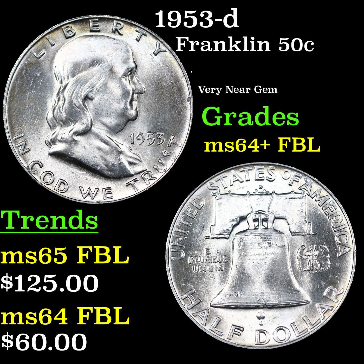 1953-d Franklin Half Dollar 50c Grades Choice Unc+ FBL.