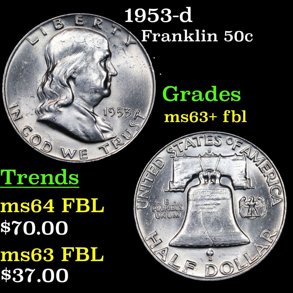 1953-d . . Franklin Half Dollar 50c Grades Select Unc+ FBL.