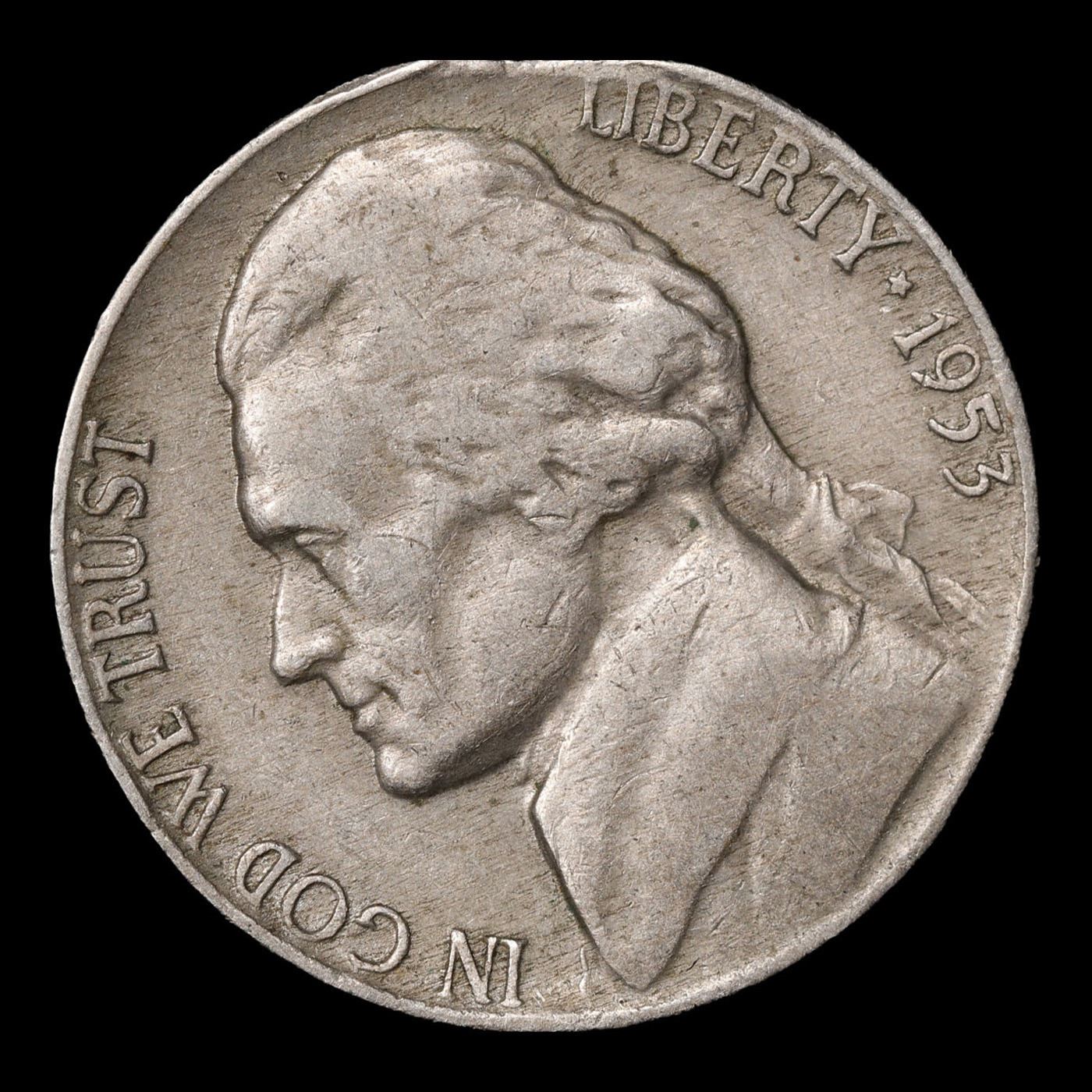1953-p Mint Error Jefferson Nickel 5c Grades vg+.