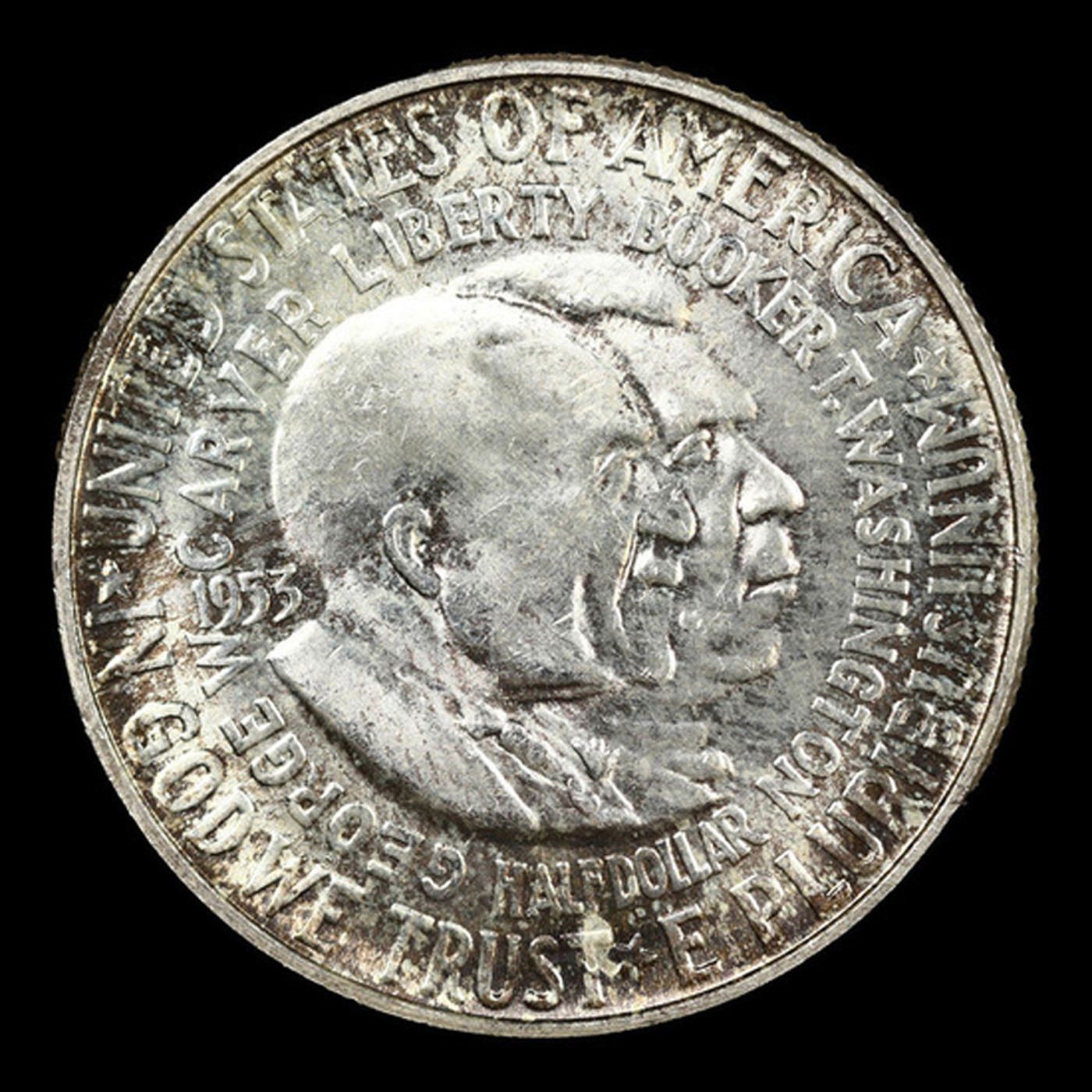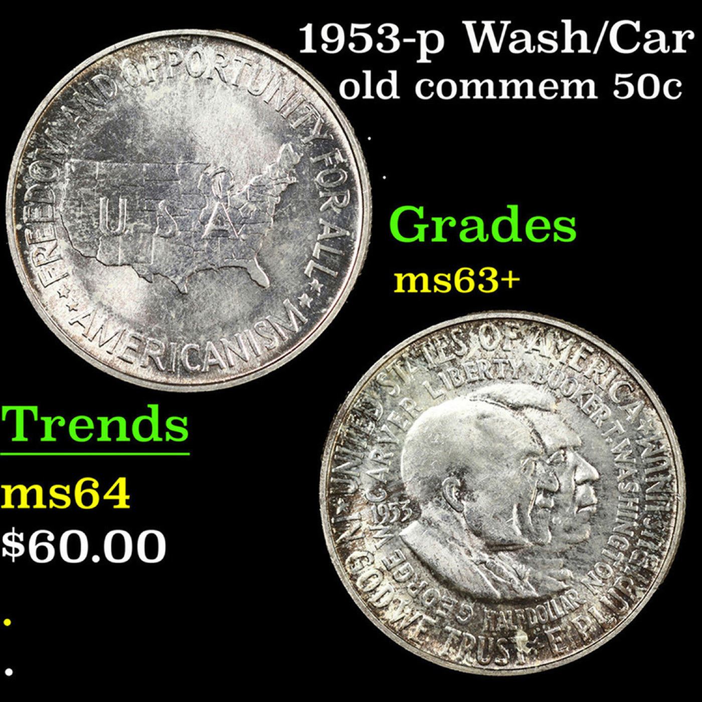 1953-p Wash/Car Old Commem Half Dollar 50c Grades Select+ Unc. The Final Coin in the Old Commemorative Program. It was Minted to Revive the Ending Booker T Washington Commemorative and to Honor Washington Carver. When examining a Wash/Carver examine the High Points, which are Carver's cheek on the Obverse and the Center of the USA on the Reverse.
