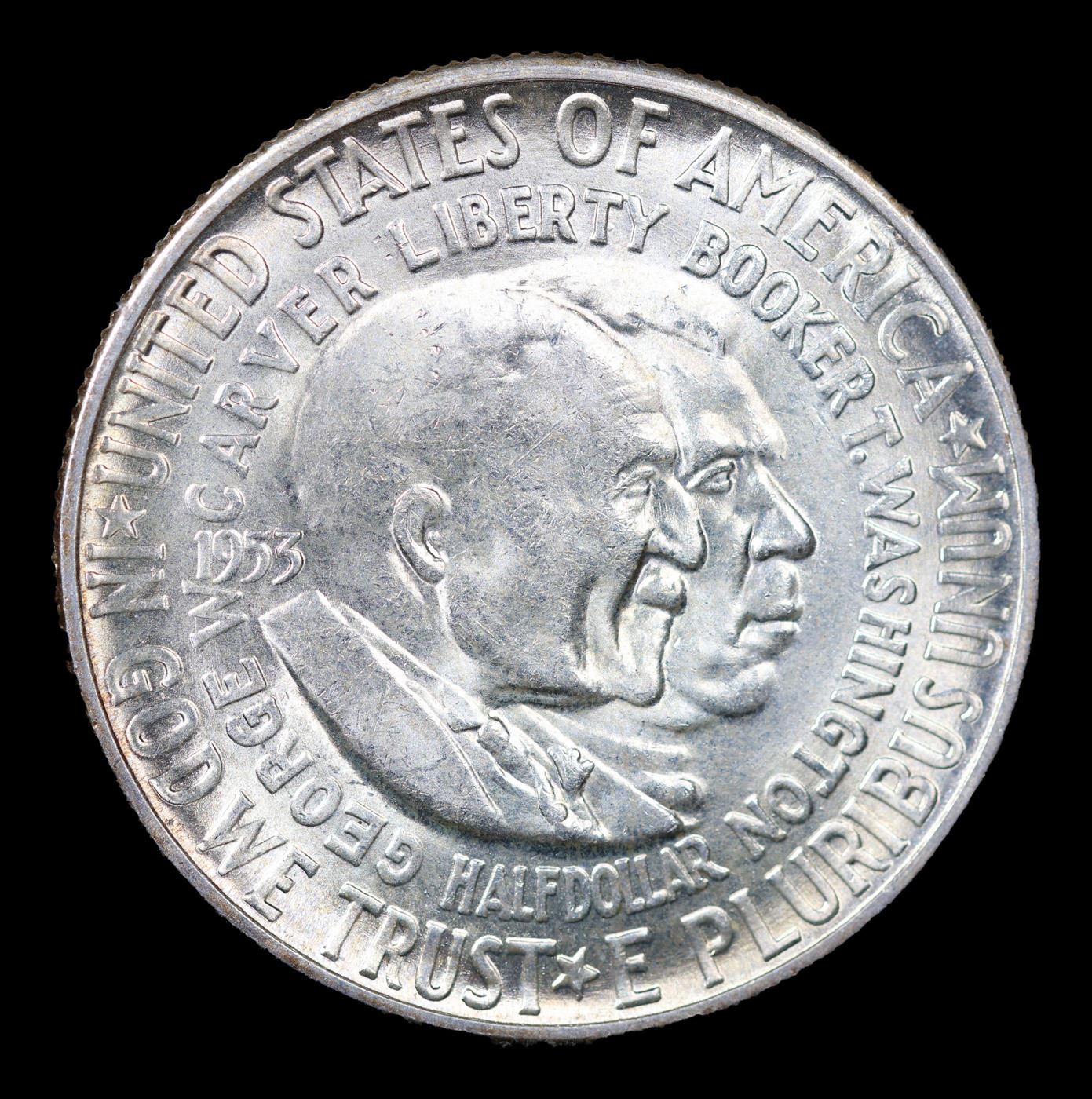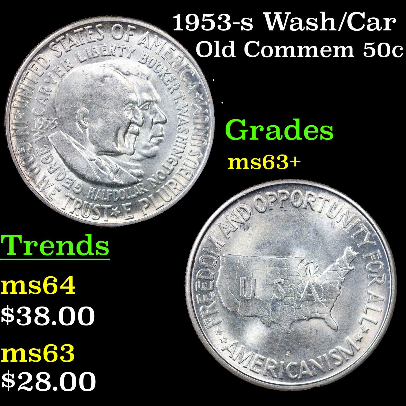 1953-s Wash/Car Old Commem Half Dollar 50c Grades Select+ Unc. The Final Coin in the Old Commemorative Program. It was Minted to Revive the Ending Booker T Washington Commemorative and to Honor Washington Carver. When examining a Wash/Carver examine the High Points, which are Carver's cheek on the Obverse and the Center of the USA on the Reverse.
