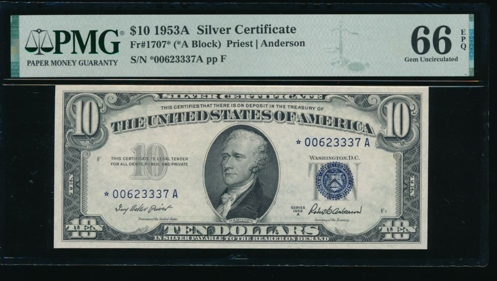 One 1953A $10 STAR Silver Certificate PMG 66EPQ.