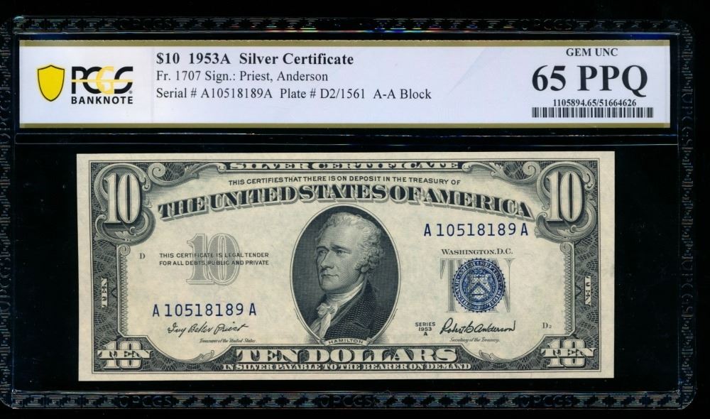 One 1953A $10 Silver Certificate PCGS 65PPQ.
