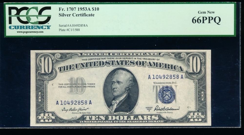 One 1953A $10 Silver Certificate PCGS 66PPQ.