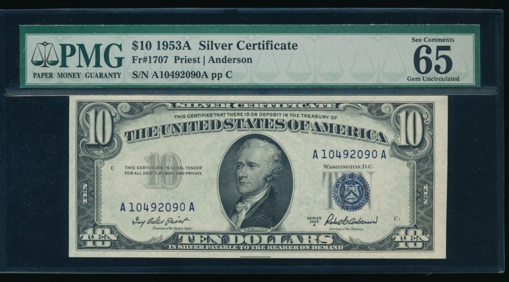 One 1953A $10 Silver Certificate PMG 65.