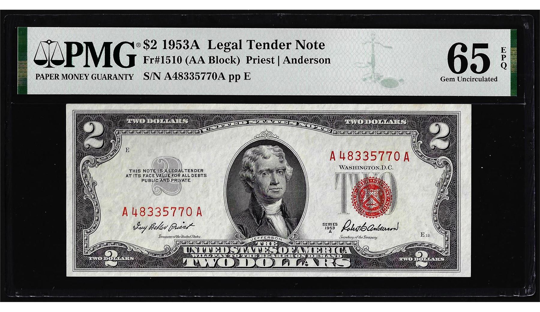 One 1953A $2 Legal Tender Note Fr.1510 PMG Gem Uncirculated 65EPQ. PMG Certified.