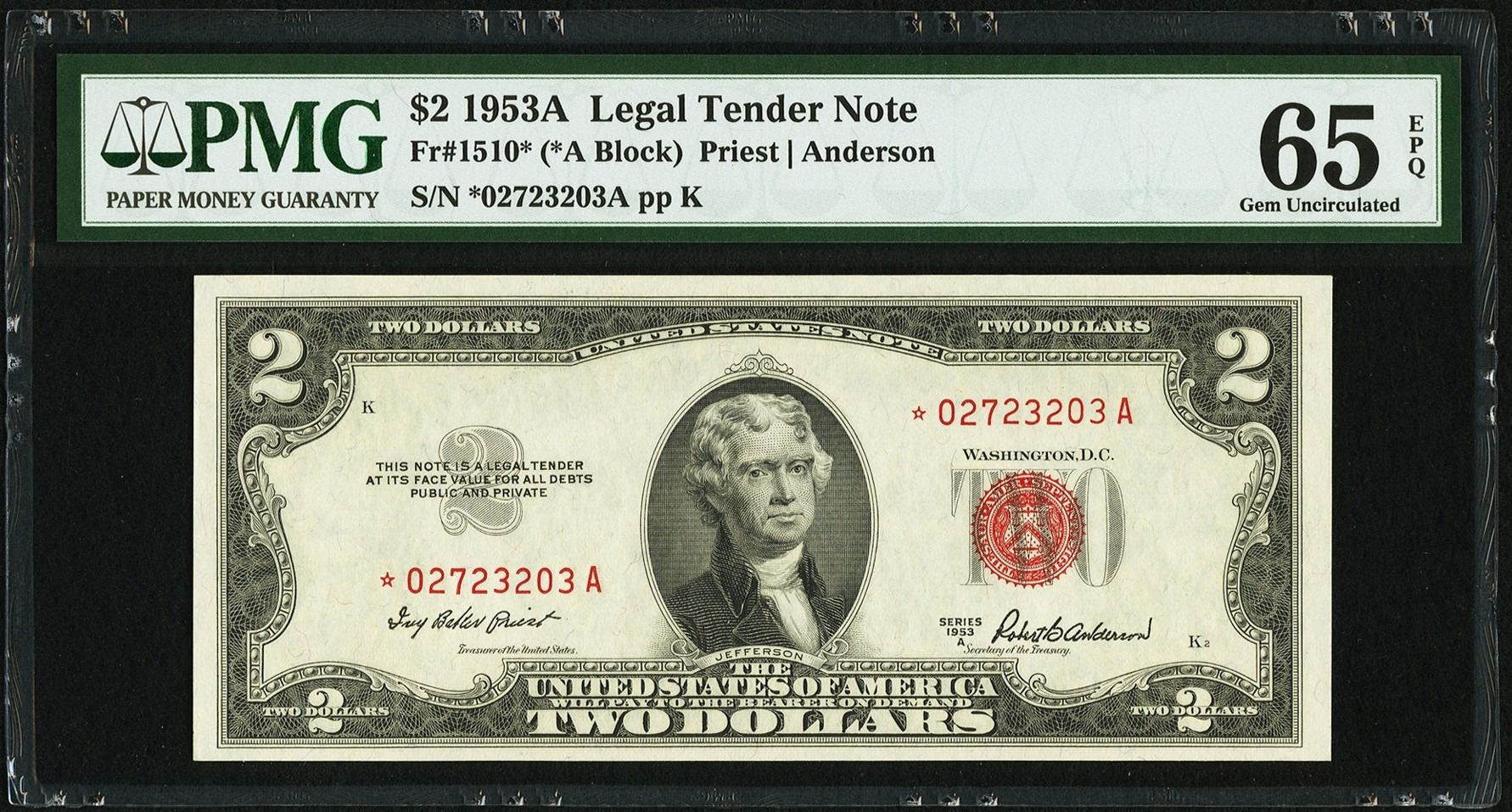 One 1953A $2 Legal Tender STAR Note PMG 65EPQ.