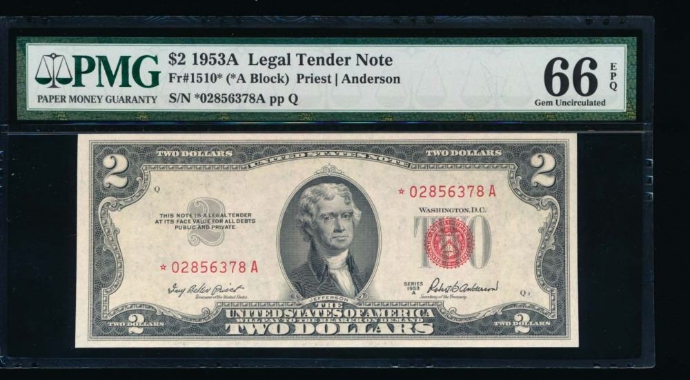 One 1953A $2 Legal Tender STAR Note PMG 66EPQ.