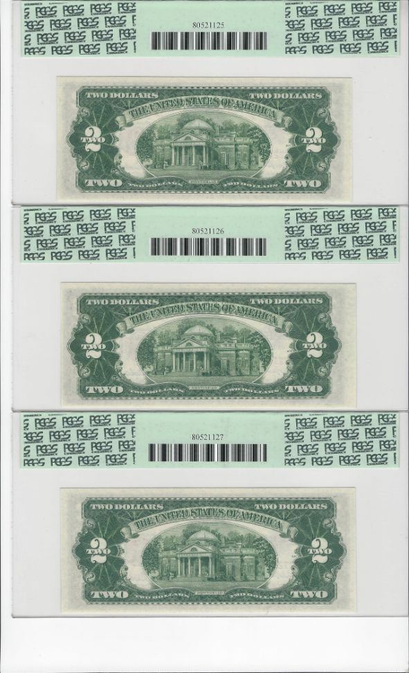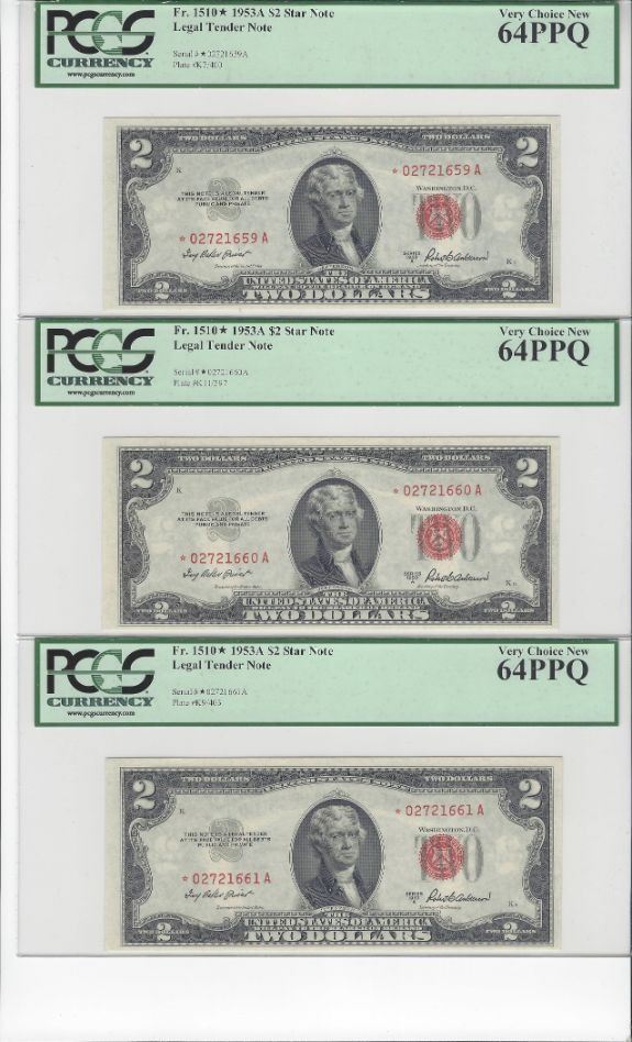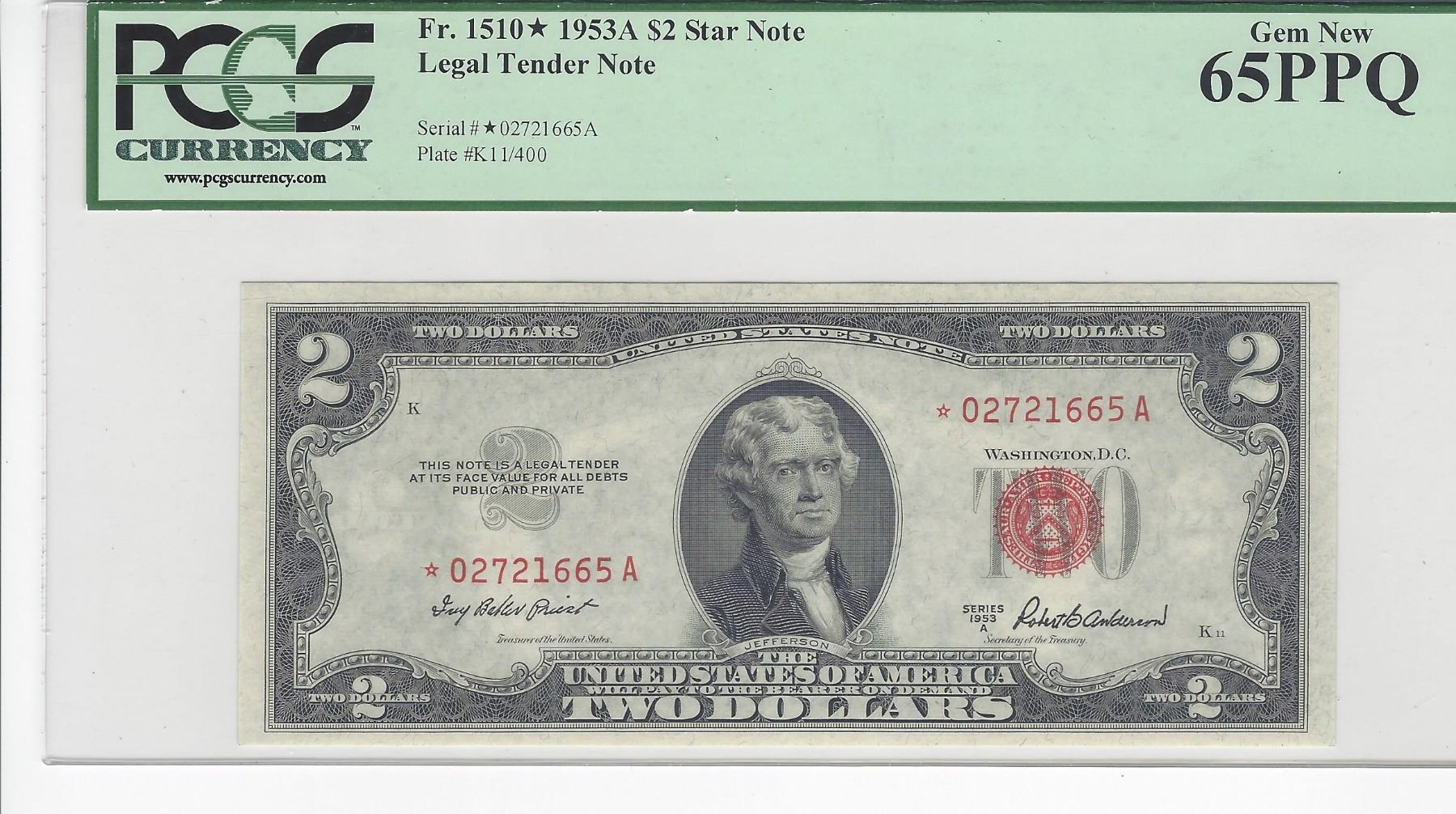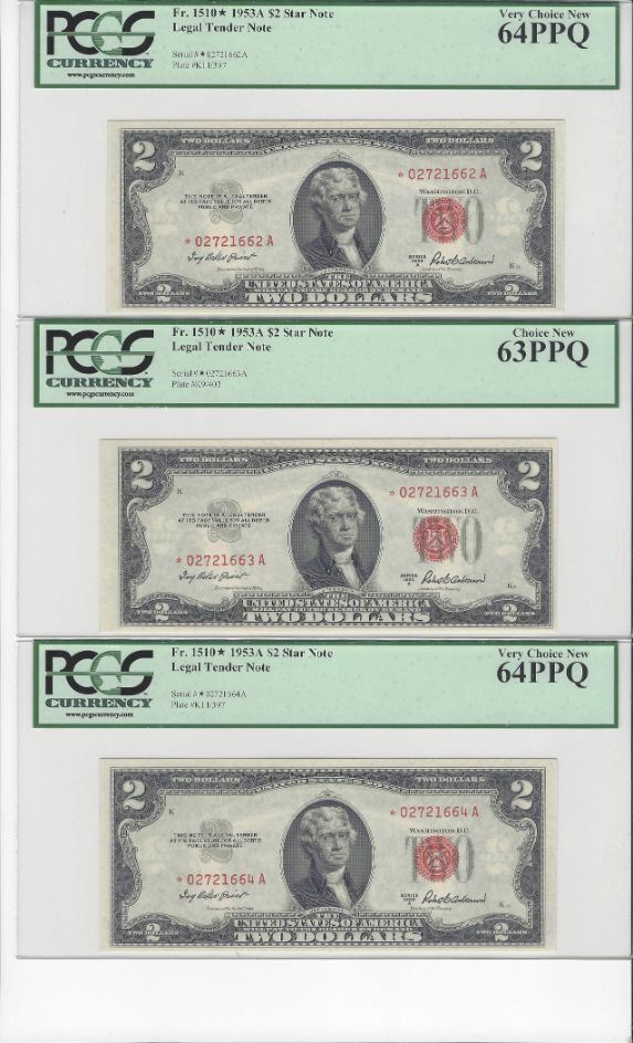 Excellent 1953A STAR $2 Legal Tender replacement notes. 7 consecutive notes in this run. 1 graded in 65 PPQ Gem New, 5 graded in 64 PPQ Very Choice New, and 1 graded in 63 PPQ Choice New. The notes are well centered and the embossing and ink pops off the notes.