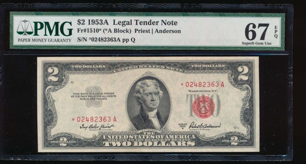 One 1953A $2 Legal Tender Star Note PMG 67EPQ.