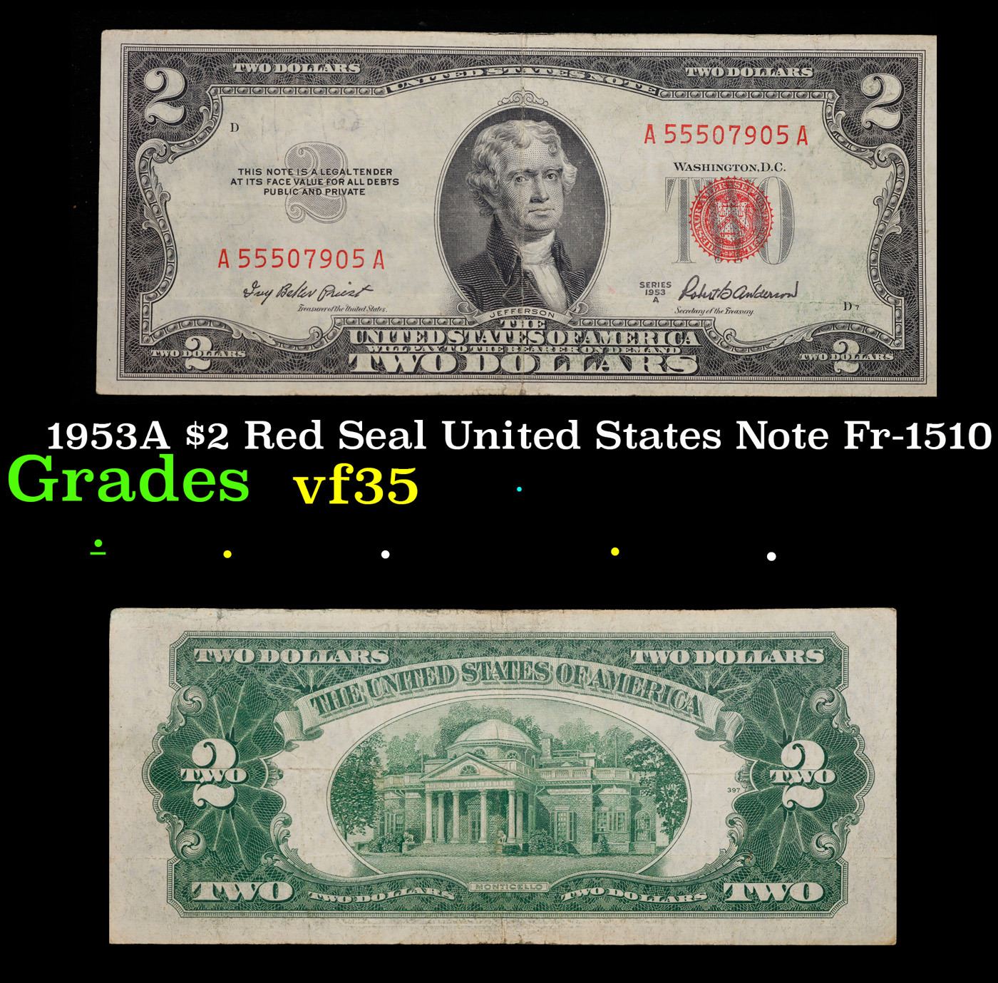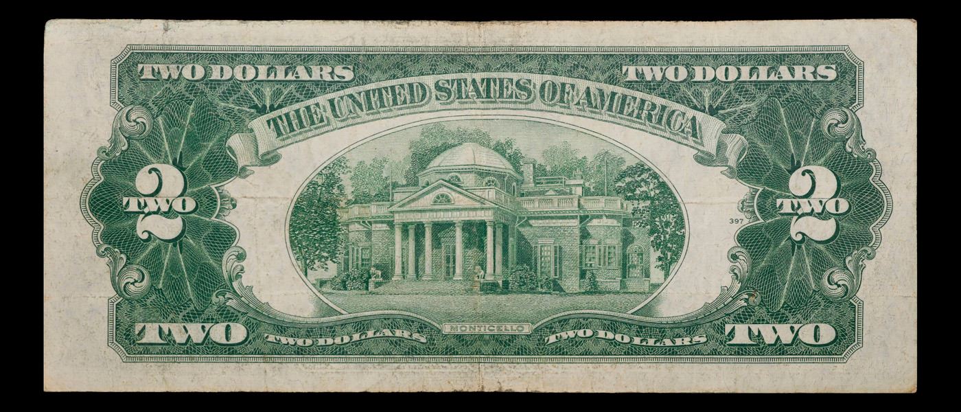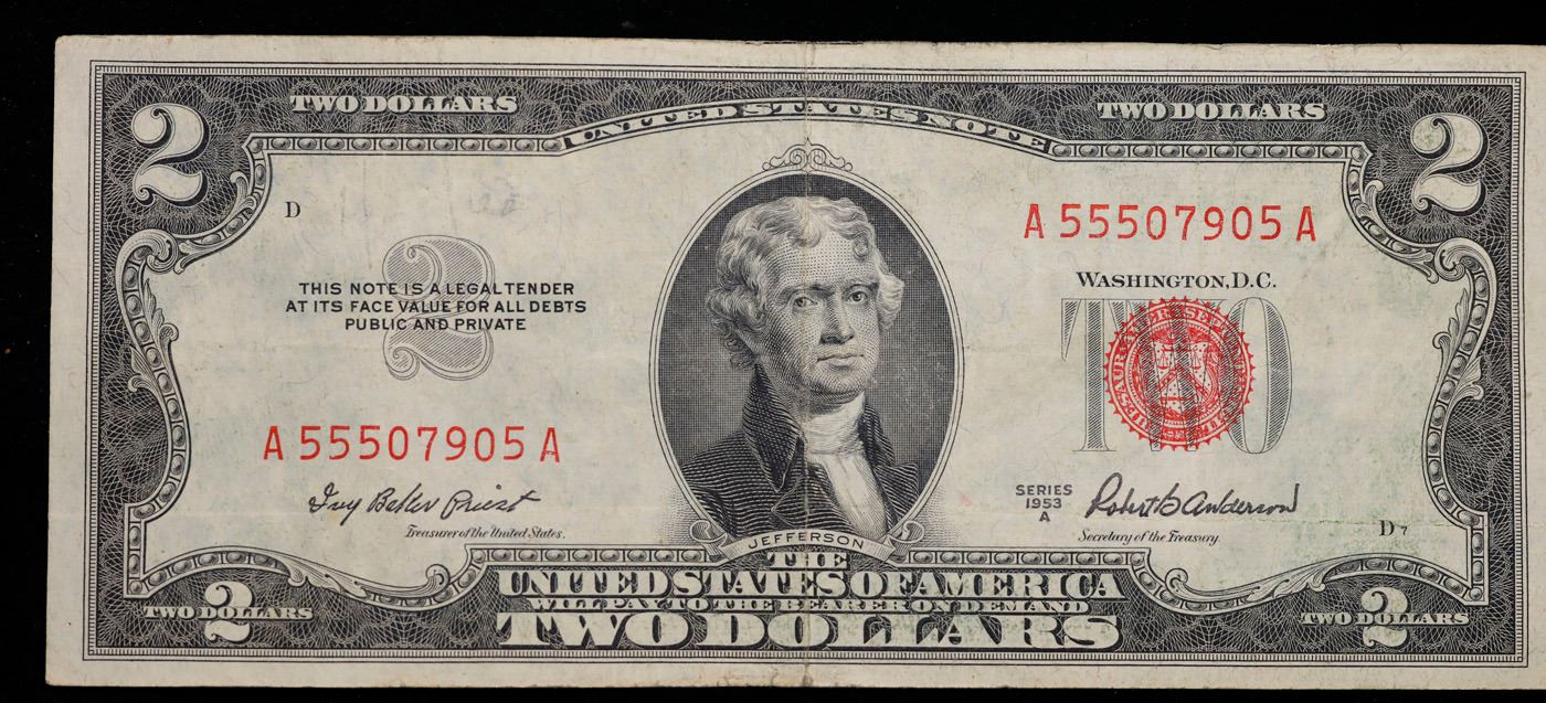 1953A $2 Red Seal United States Note Fr-1510 Grades vf++. 1953 red print two dollar bills can be broke up into four different types by signature combination; 1953 – Ivy Baker Priest (Treasurer of The United States) and G.M. Humphrey (Secretary of the Treasury), 1953A – Ivy Baker Priest and Robert B Anderson, 1953B – Elizabeth Rudel Smith and C. Douglas Dillon, 1953C – Kathryn O’Hay Granahan and C. Douglas Dillon. 1953 two dollar bills feature Thomas Jefferson as the central figure. The back of the bill shows Monticello. These were printed in Washington DC and circulated across the country. They have red overprints and a red seal on the right hand side of the bill. You can find the following phrases on the bill: “Two Dollars, United States Note, The United States of America will pay to the bearer on demand Two Dollars” “This note is a legal tender at its face value for all debts public and private”