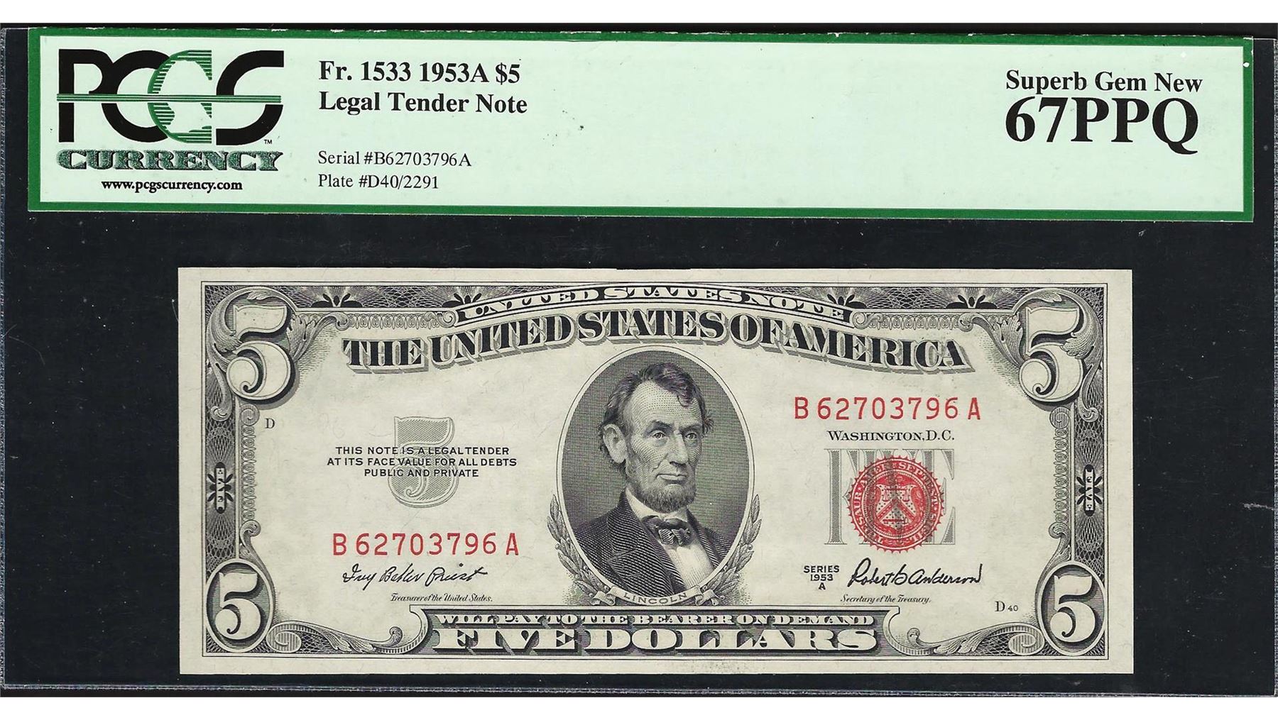 One 1953A $5 Legal Tender Note Fr. 1533 PCGS Superb Gem New 67PPQ. PCGS Graded.