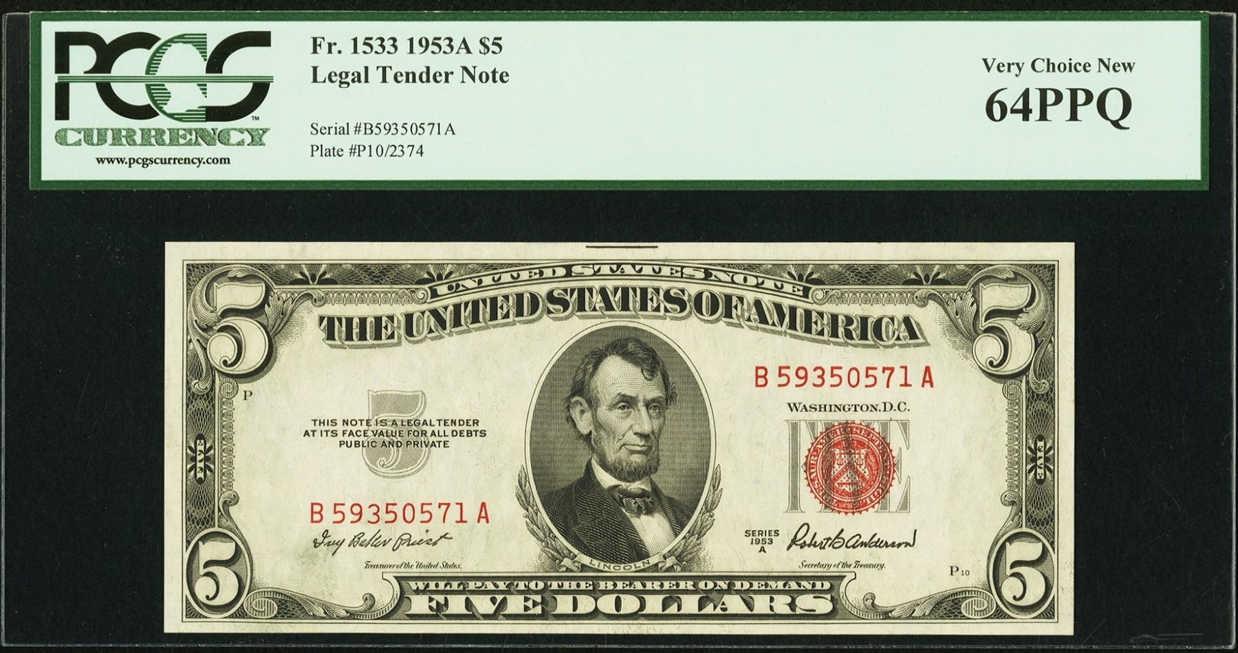 One 1953A $5 Legal Tender Note PCGS 64PPQ.