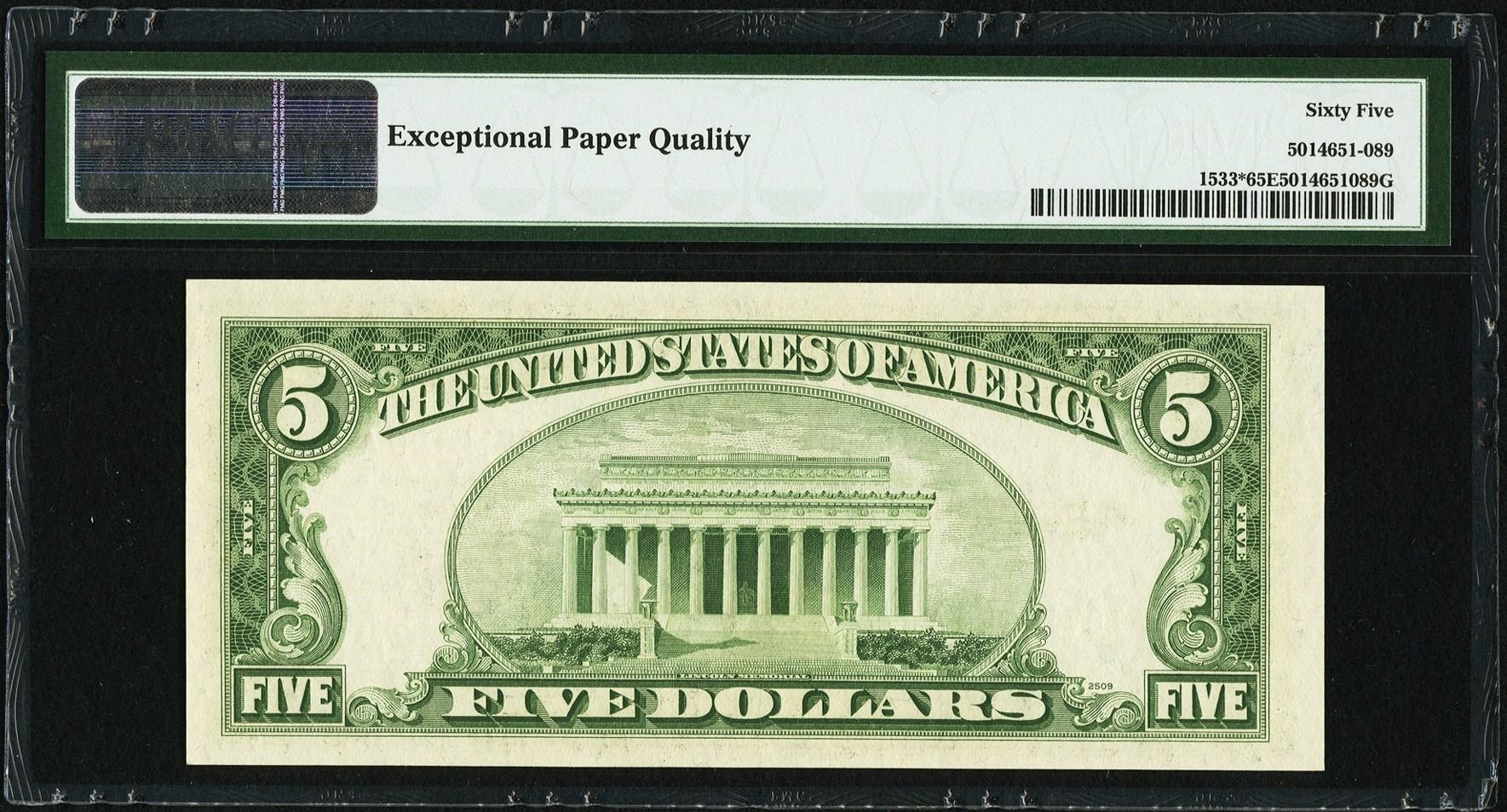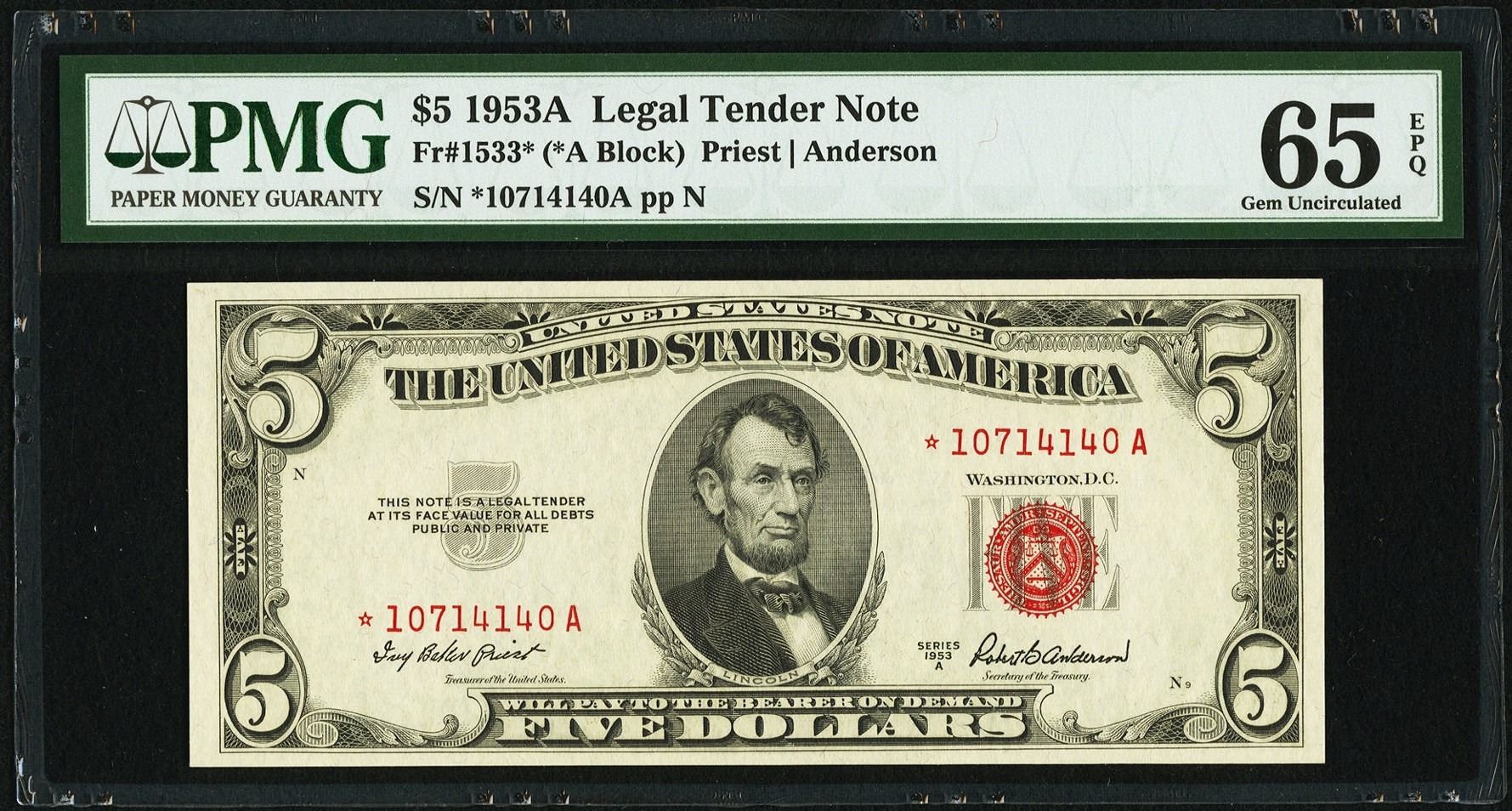 One 1953A $5 Legal Tender STAR Note PMG 65EPQ.