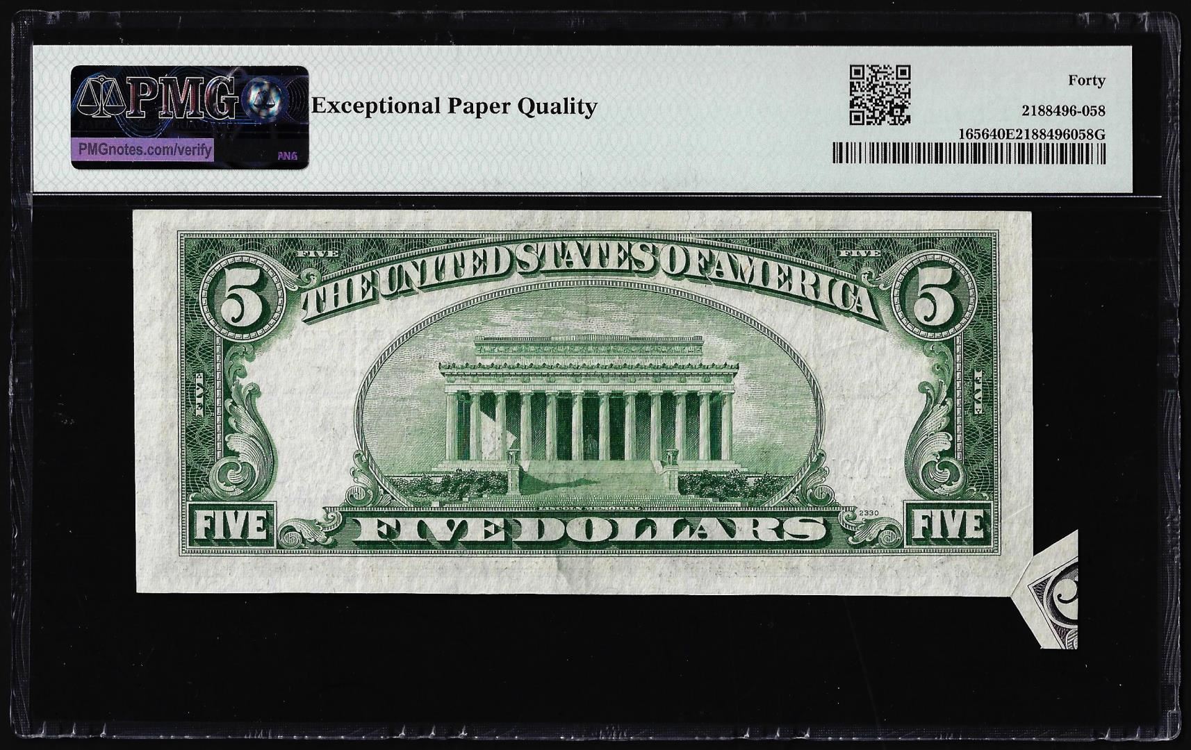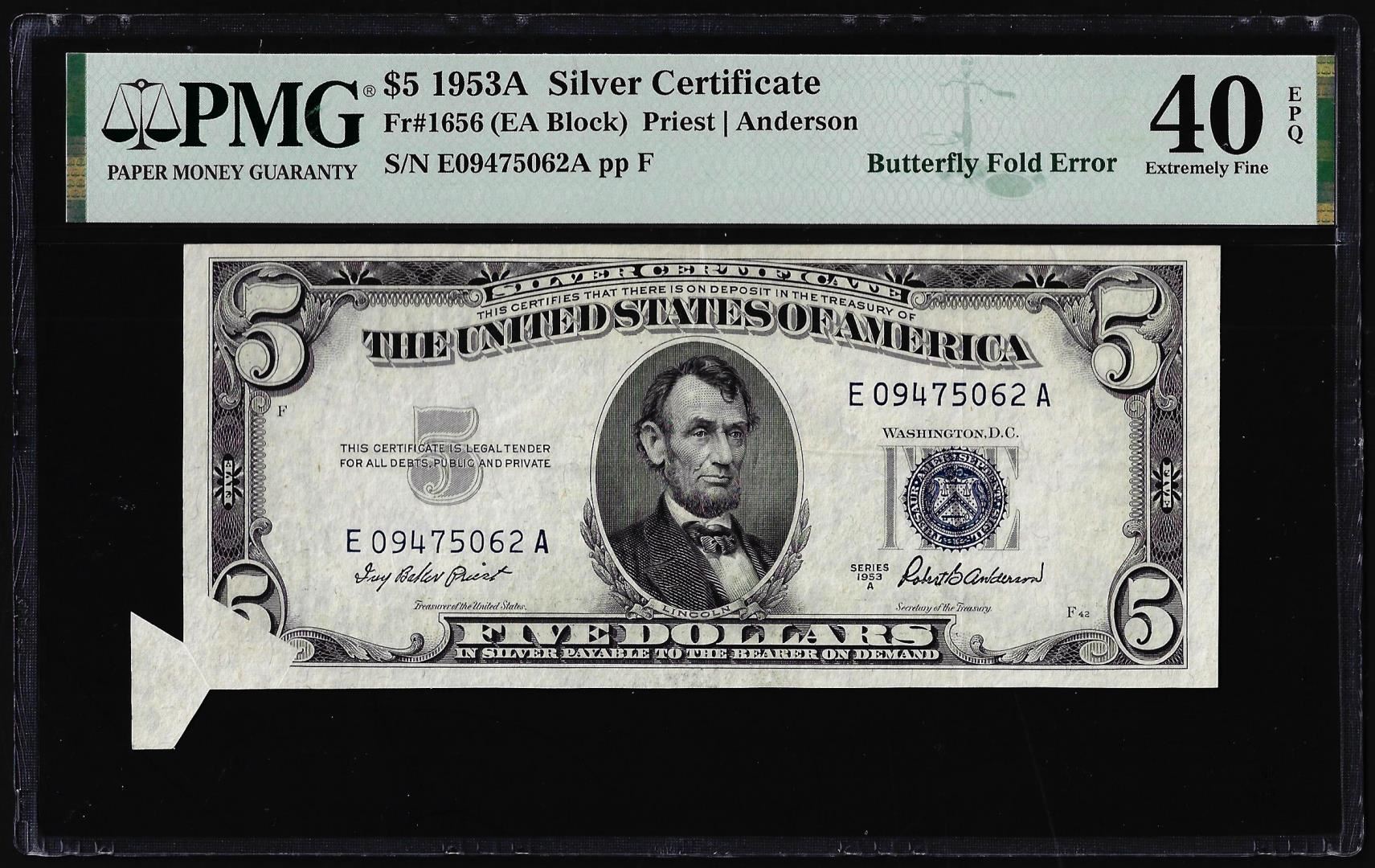One 1953A $5 Silver Certificate Butterfly Fold ERROR Note PMG Extremely Fine 40EPQ. PMG Certified.