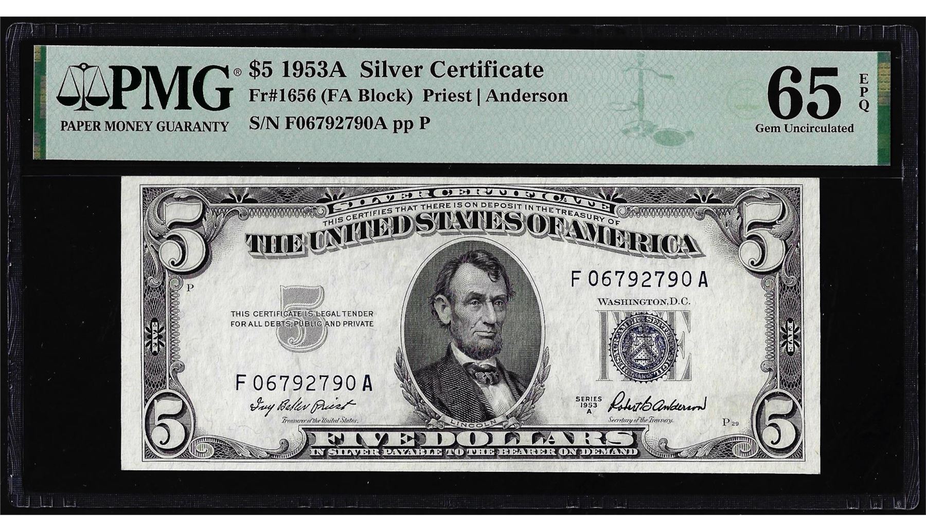 One 1953A $5 Silver Certificate Note Fr.1656 PMG Gem Uncirculated 65EPQ. PMG Certified.