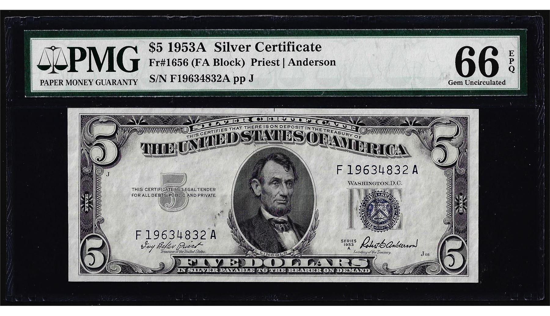 One 1953A $5 Silver Certificate Note Fr.1656 PMG Gem Uncirculated 66EPQ. PMG Certified.