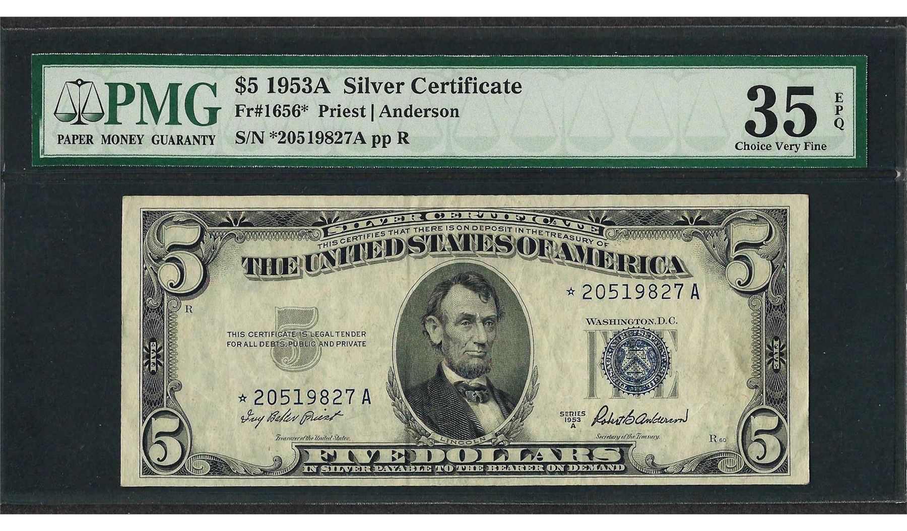 One 1953A $5 Silver Certificate STAR Note Fr.1656* PMG Choice Very Fine 35EPQ. PMG Certified.