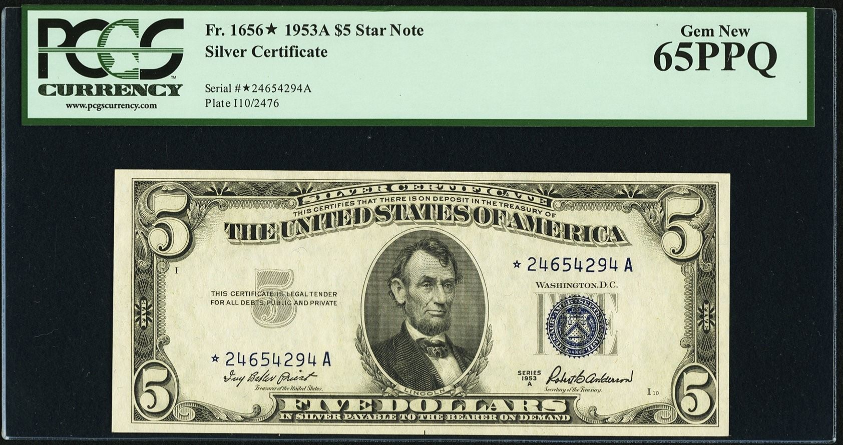 One 1953A $5 Silver Certificate STAR Note PCGS 65PPQ.