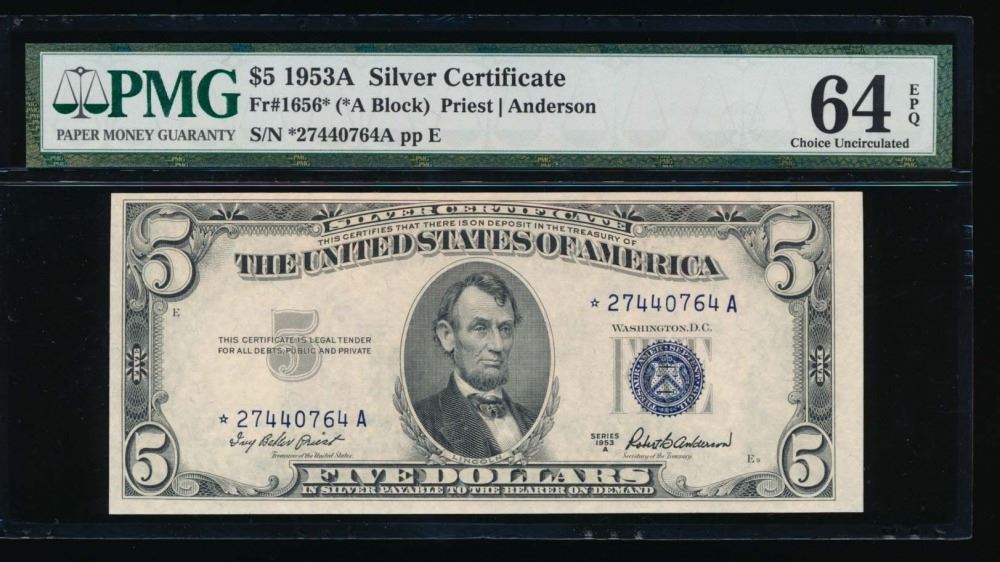 One 1953A $5 Silver Certificate STAR Note PMG 64EPQ.