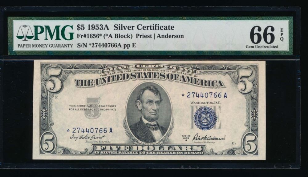 One 1953A $5 Silver Certificate STAR PMG 66EPQ.