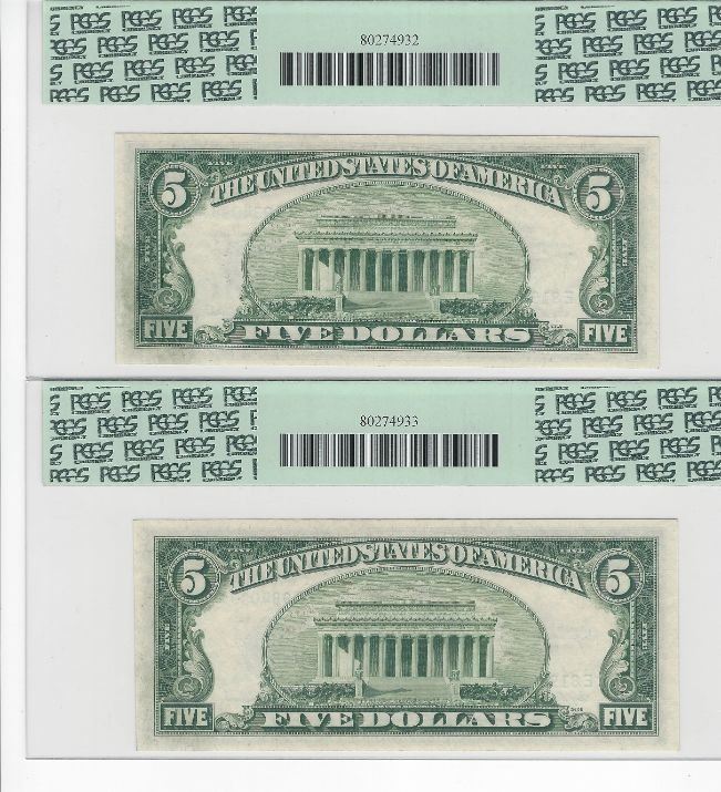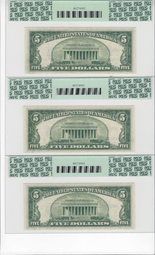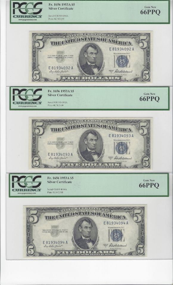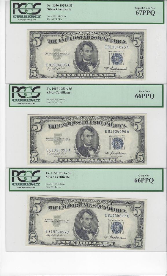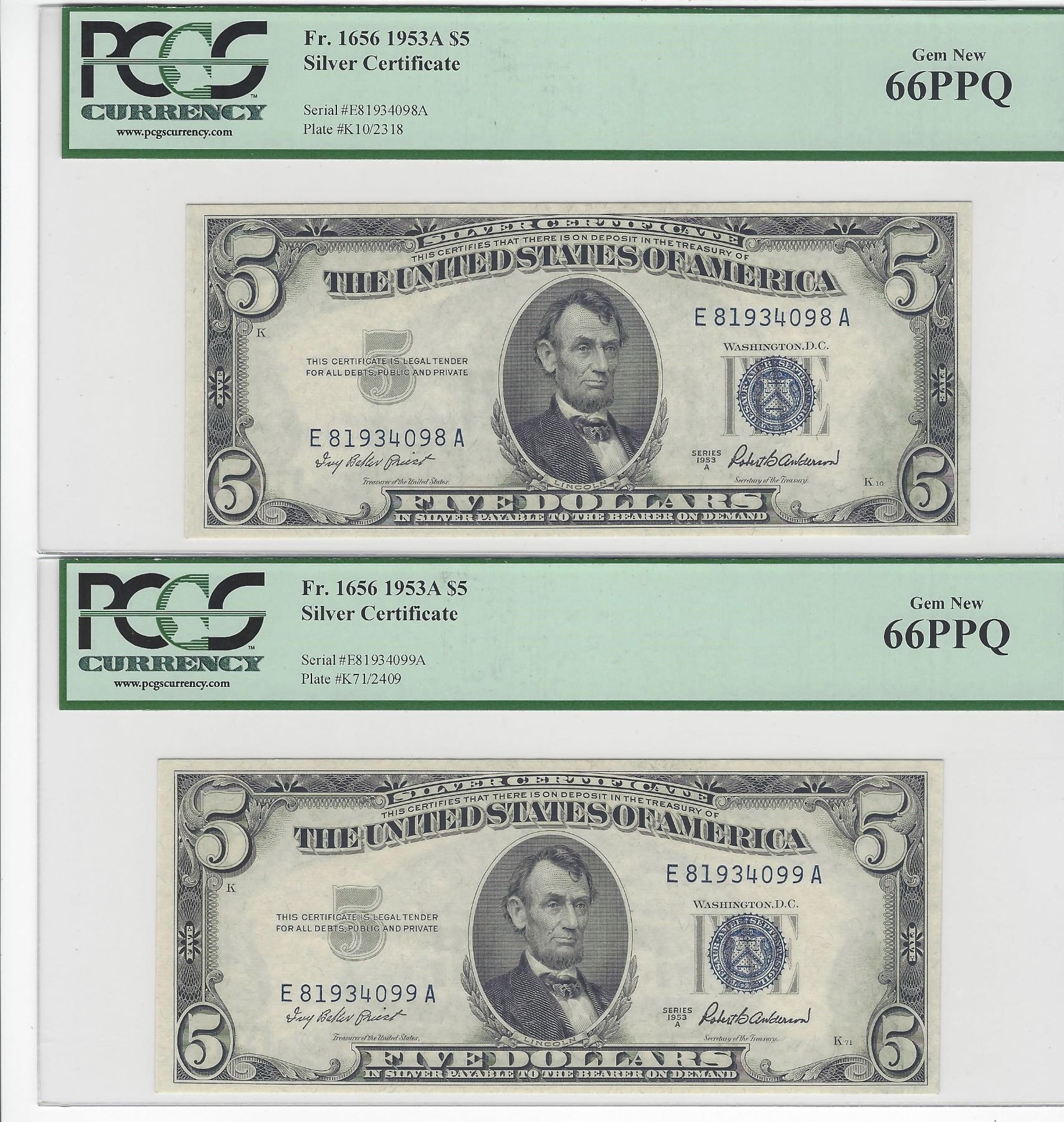 Beautiful 8 consecutive run of 1953A $5 Silver Certificates. 1 graded in 67 PPQ Superb Gem New. 7 graded in 66 PPQ Gem New. All of the notes are very well centered. The embossing and color of the ink pops off of the notes.