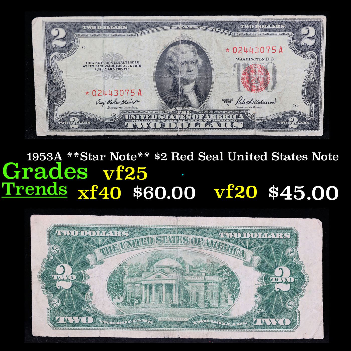 1953A **Star Note** $2 Red Seal United States Note Grades vf+. When notes are discovered that have been printed incorrectly (such as having the serial numbers upside down, etc.) the misprinted "error notes" are replaced with star notes because no two bills within a certain series can be produced with the same serial number. They are used to maintain a correct count of notes in a serial number run. By their nature, star notes are more scarce than notes with standard serial numbers and as such are widely collected by numismatists. Some of the highest prices paid for modern (post-1928) U.S. banknotes have been for star notes.