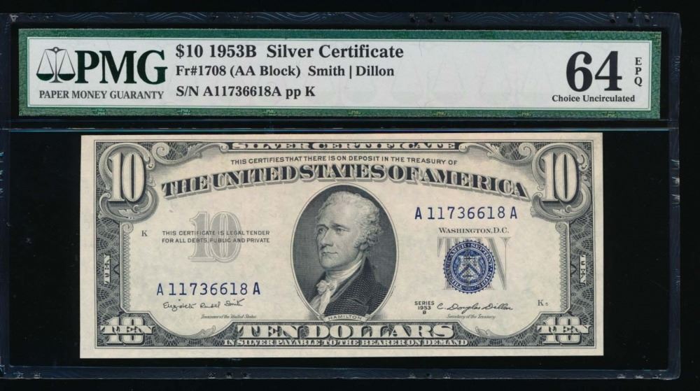One 1953B $10 Silver Certificate PMG 64EPQ.