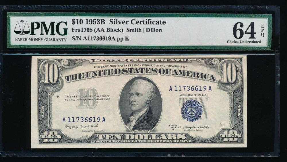 One 1953B $10 Silver Certificate PMG 64EPQ.