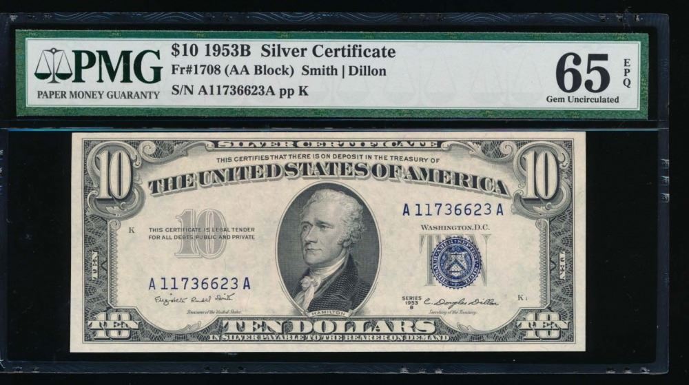One 1953B $10 Silver Certificate PMG 65EPQ.
