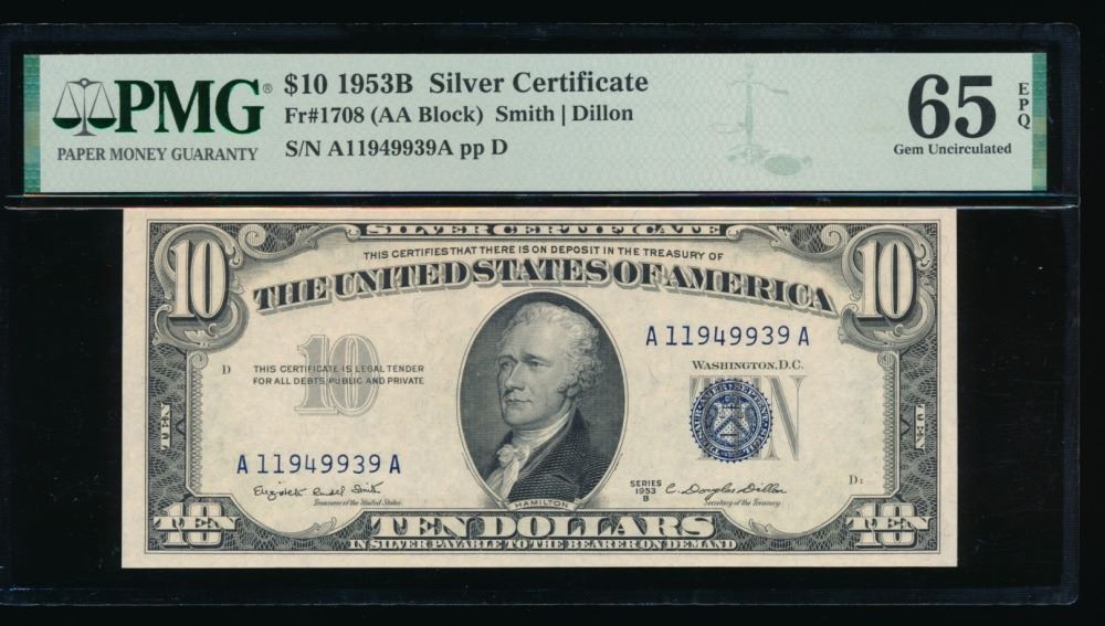 One 1953B $10 Silver Certificate PMG 65EPQ.