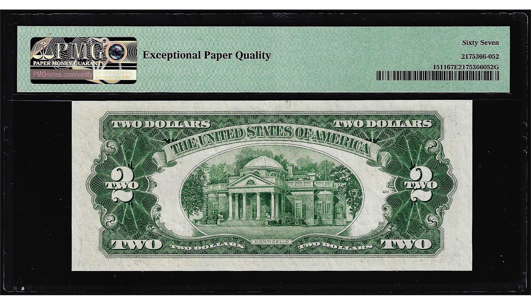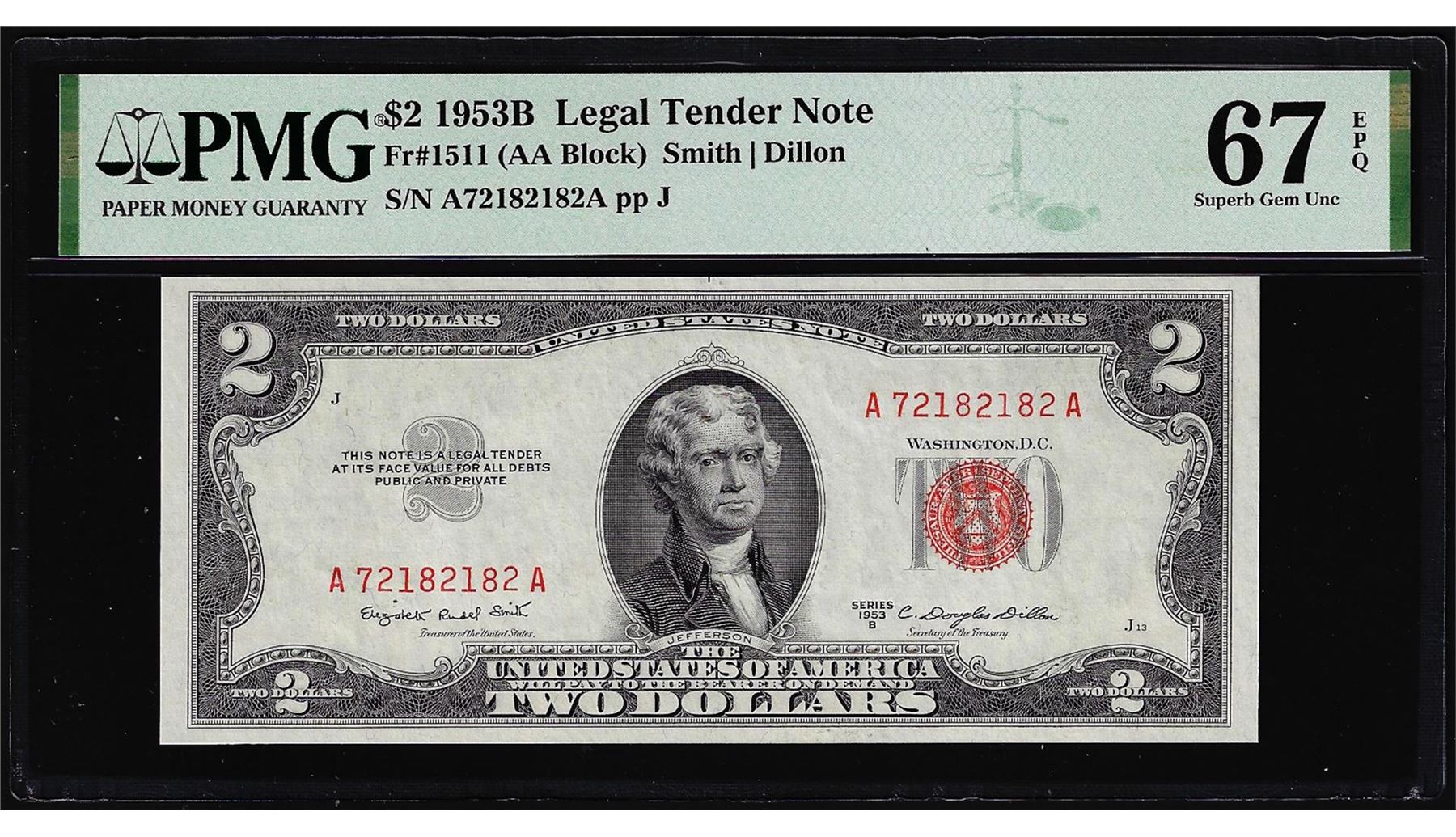 One 1953B $2 Legal Tender Note Fr.1511 PMG Superb Gem Uncirculated 67EPQ. PMG Certified.