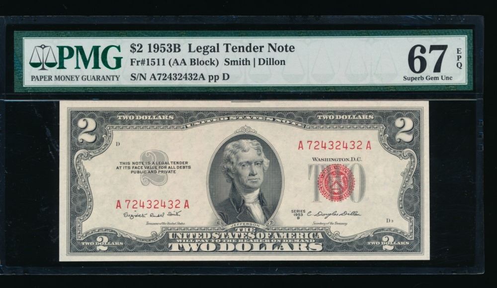 One 1953B $2 Legal Tender Note PMG 67EPQ.