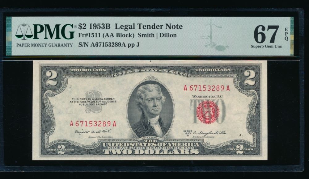 One 1953B $2 Legal Tender Note PMG 67EPQ.
