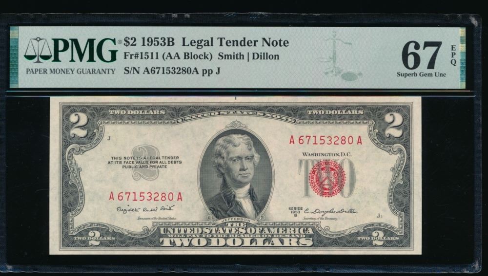 One 1953B $2 Legal Tender Note PMG 67EPQ.