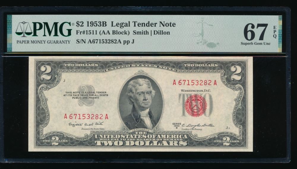One 1953B $2 Legal Tender Note PMG 67EPQ.