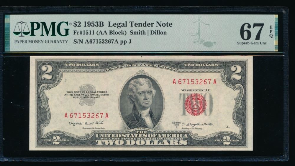 One 1953B $2 Legal Tender Note PMG 67EPQ.