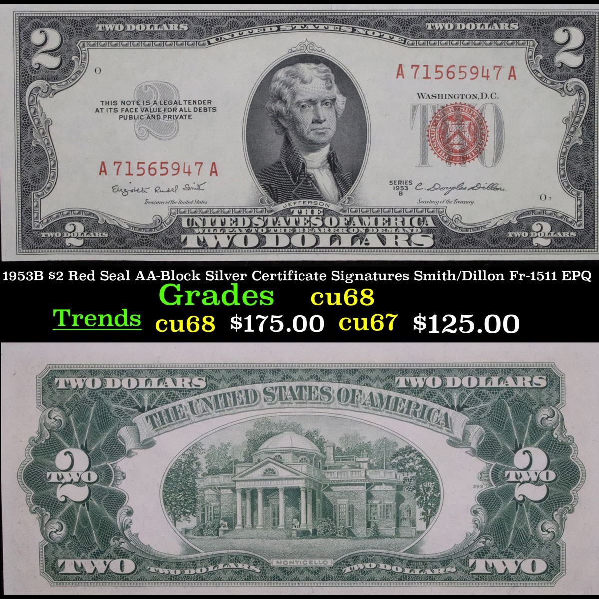 1953B $2 Red Seal AA-Block Silver Certificate Signatures Smith/Dillon Fr-1511 EPQ . Grades Gem++ CU.
