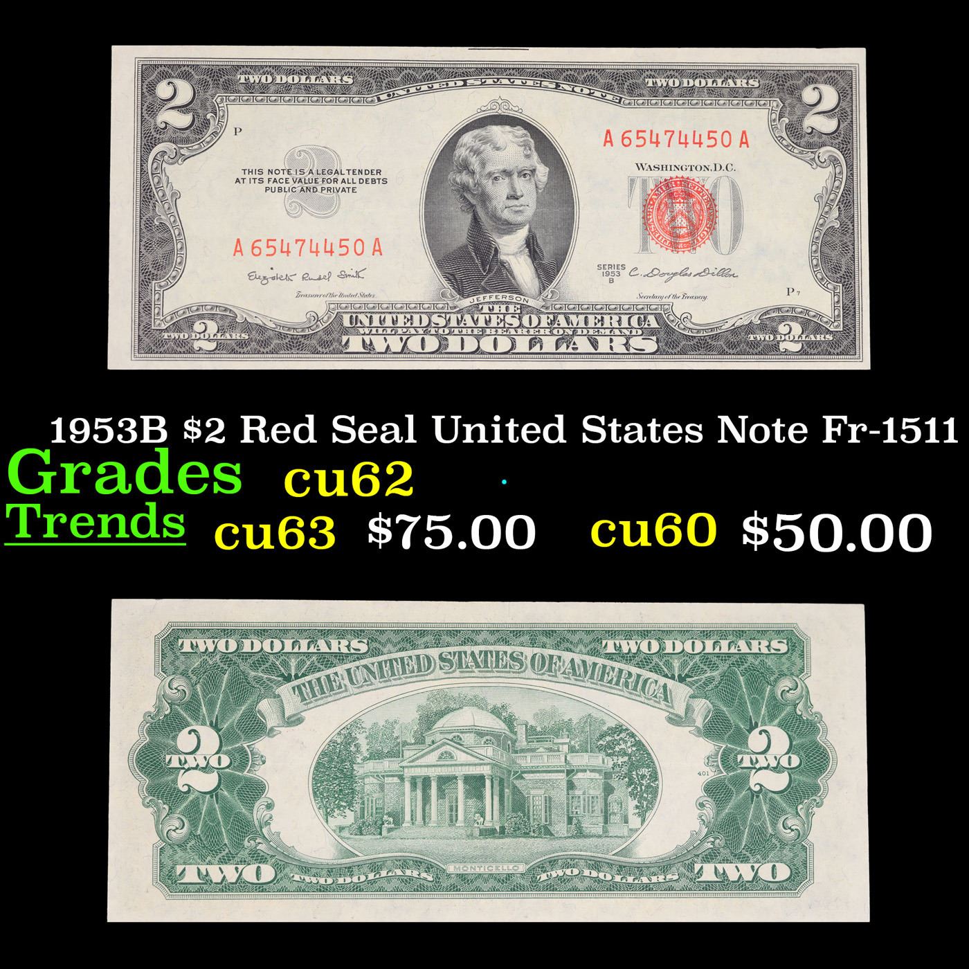 1953B $2 Red Seal United States Note Fr-1511 Grades Select CU. 1953 red print two dollar bills can be broke up into four different types by signature combination; 1953 – Ivy Baker Priest (Treasurer of The United States) and G.M. Humphrey (Secretary of the Treasury), 1953A – Ivy Baker Priest and Robert B Anderson, 1953B – Elizabeth Rudel Smith and C. Douglas Dillon, 1953C – Kathryn O’Hay Granahan and C. Douglas Dillon. 1953 two dollar bills feature Thomas Jefferson as the central figure. The back of the bill shows Monticello. These were printed in Washington DC and circulated across the country. They have red overprints and a red seal on the right hand side of the bill. You can find the following phrases on the bill: “Two Dollars, United States Note, The United States of America will pay to the bearer on demand Two Dollars” “This note is a legal tender at its face value for all debts public and private”