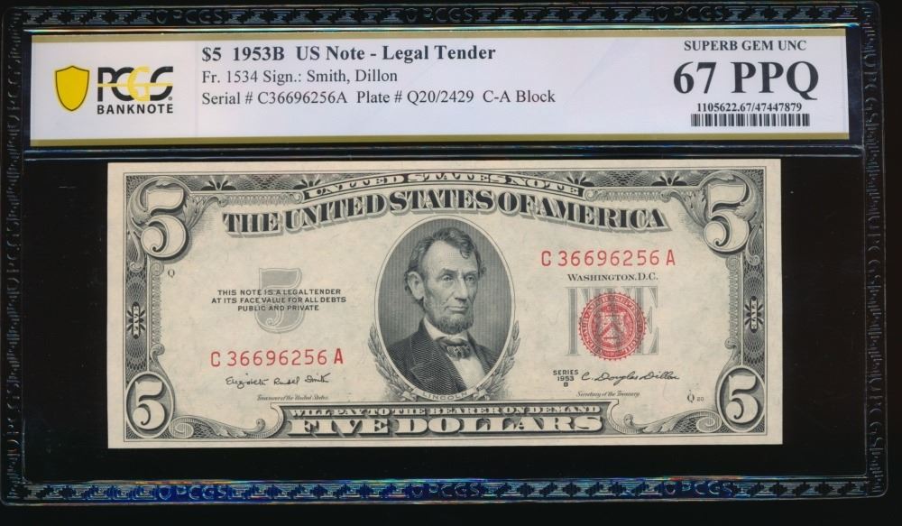 One 1953B $5 Legal Tender Note PCGS 67PPQ.
