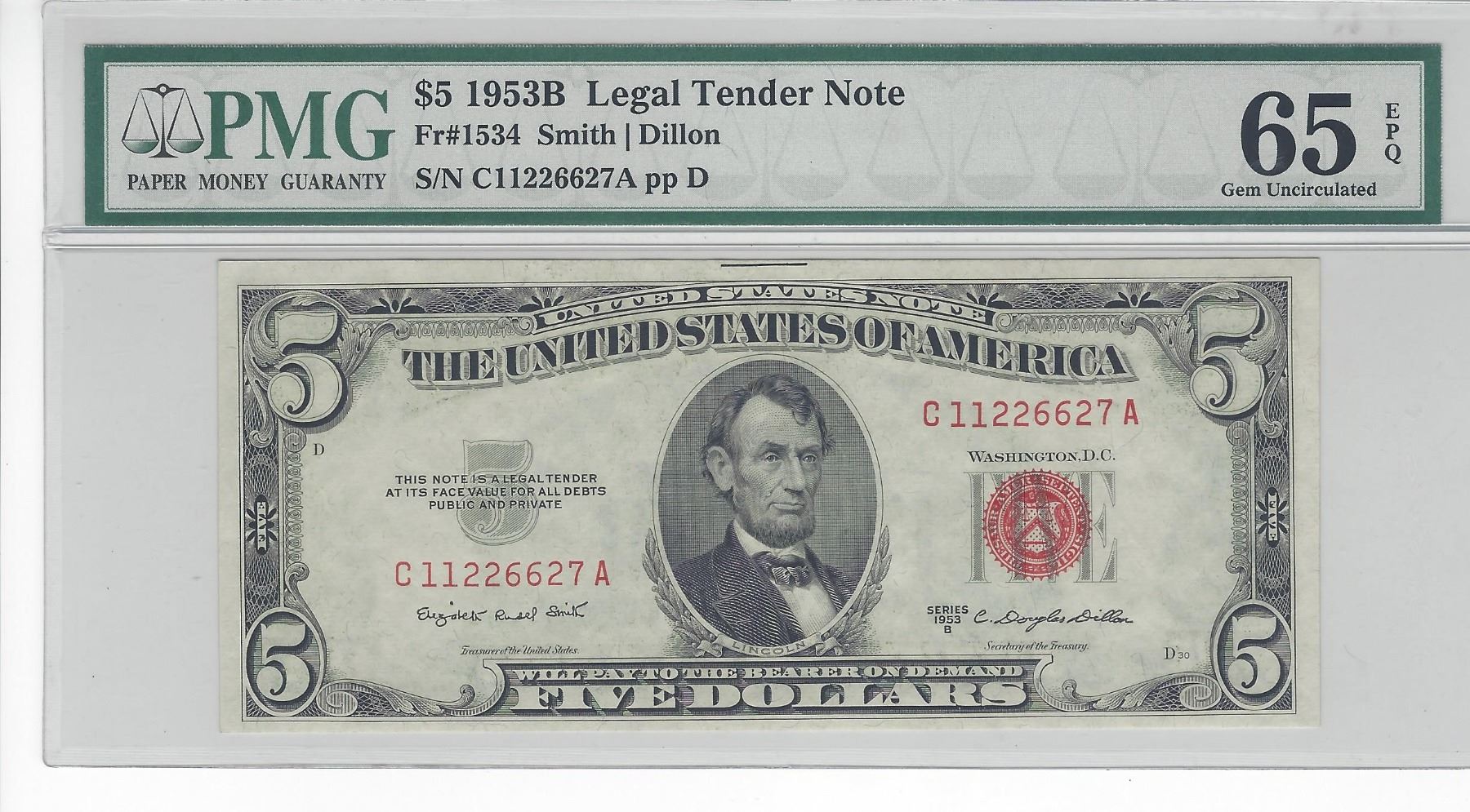 One 1953B $5 Legal Tender Note PMG 65EPQ.
