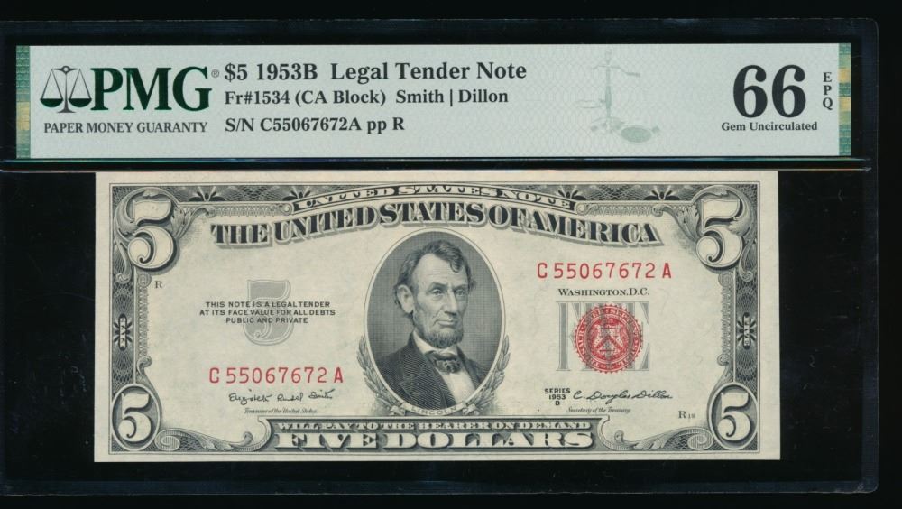 One 1953B $5 Legal Tender Note PMG 66EPQ.