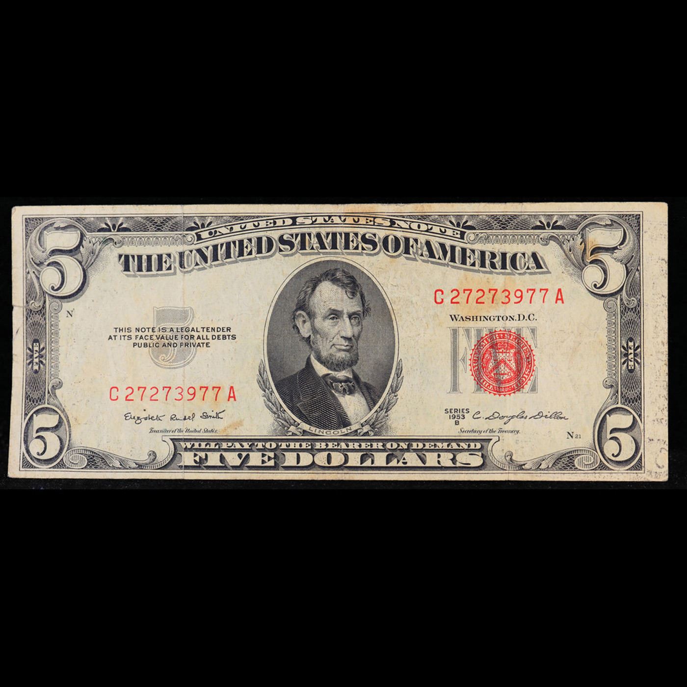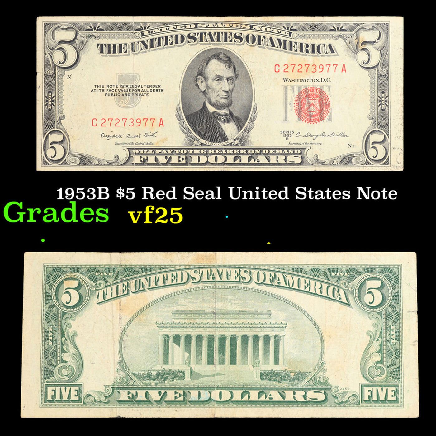 1953B $5 Red Seal Fancy Serial United States Note Grades vf+.