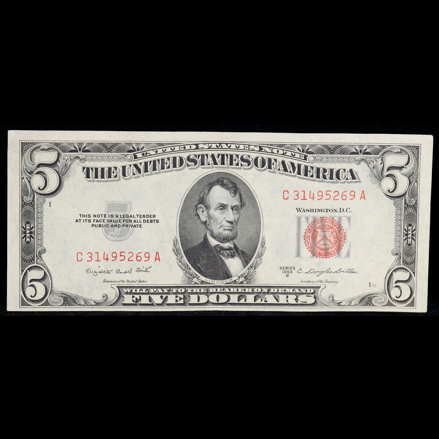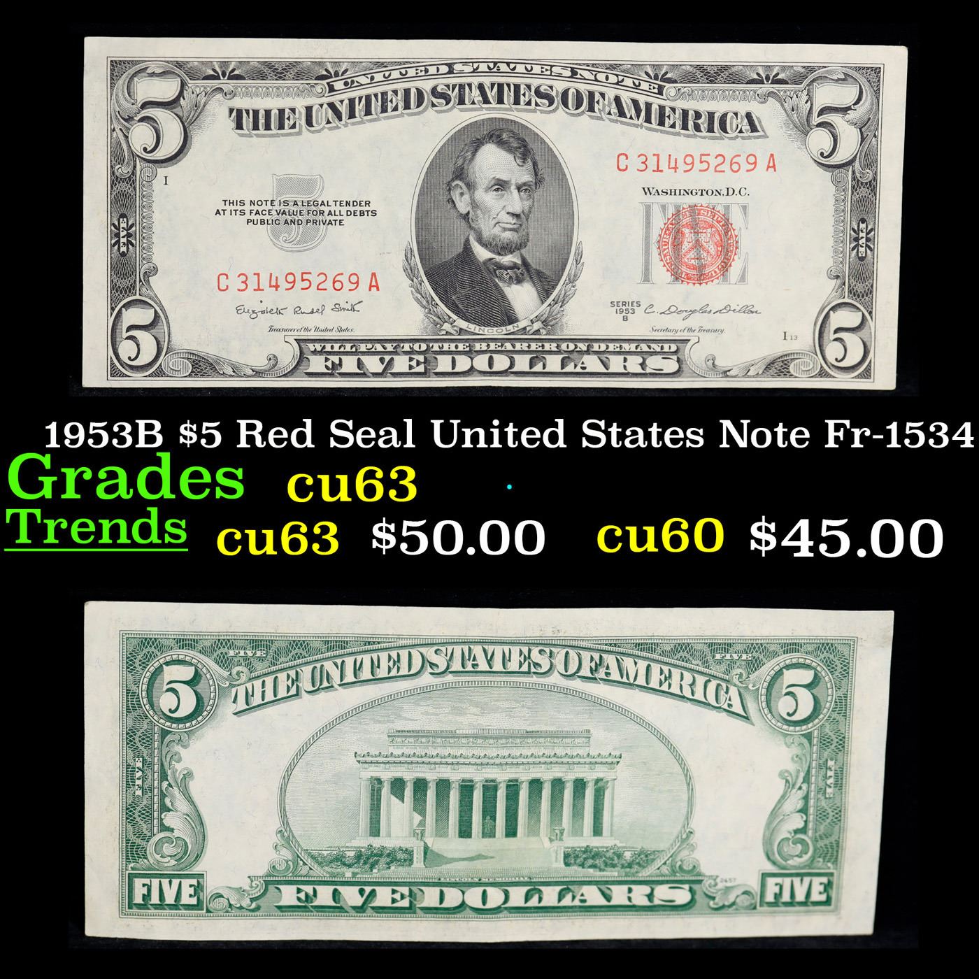 1953B $5 Red Seal United States Note Fr-1534 Grades Select CU.
