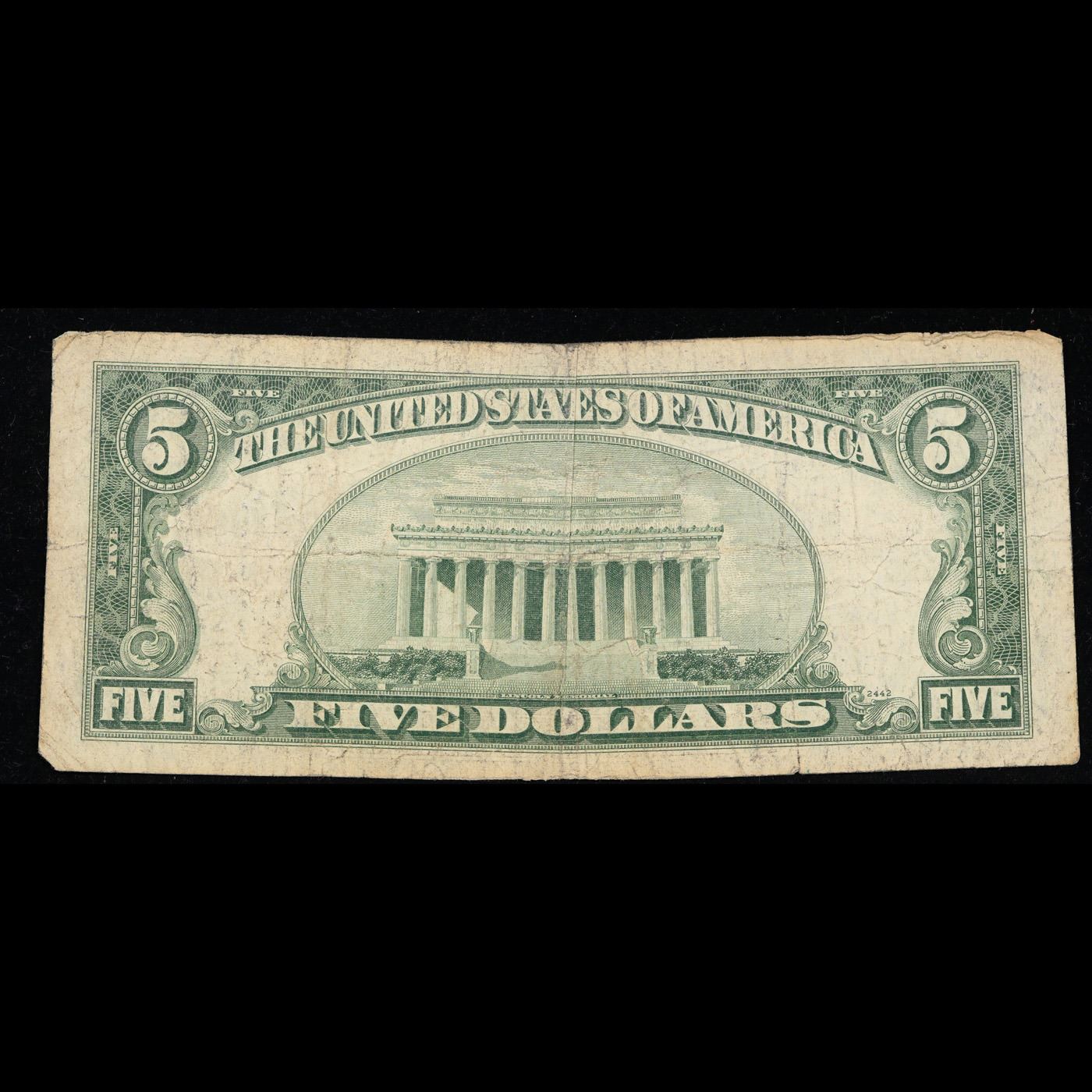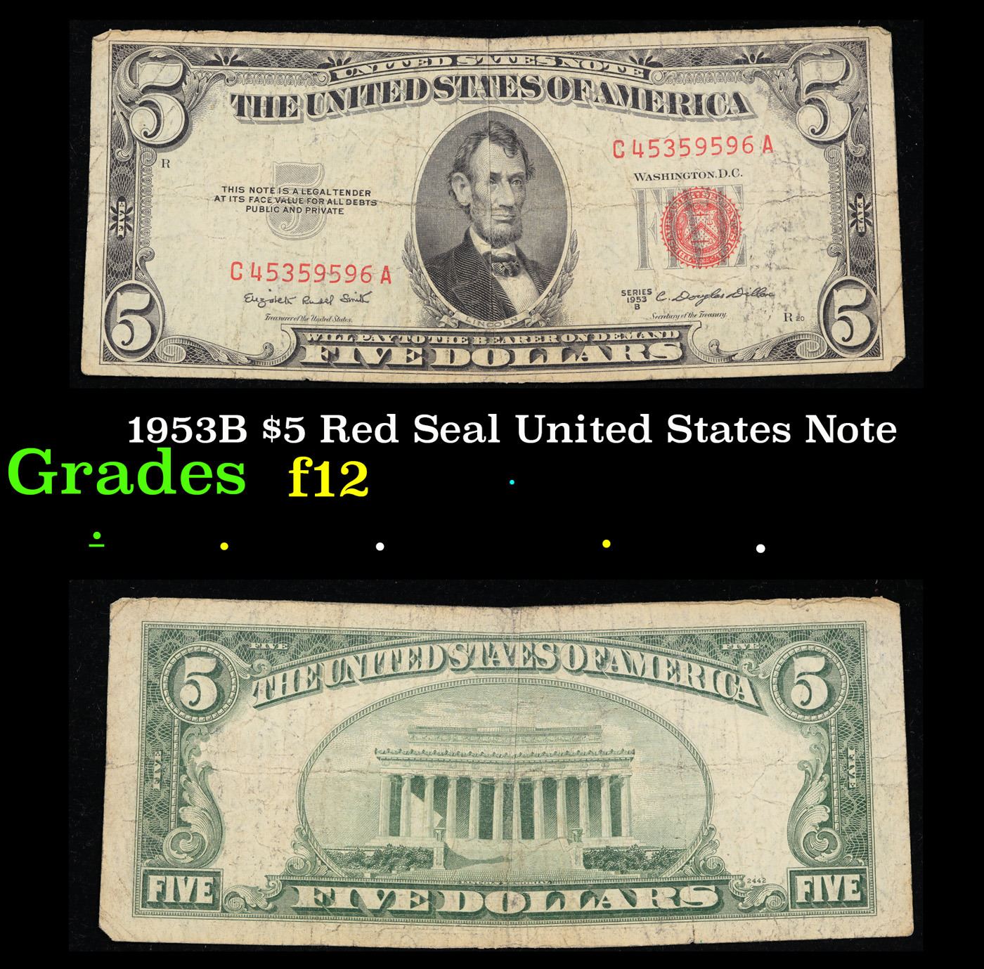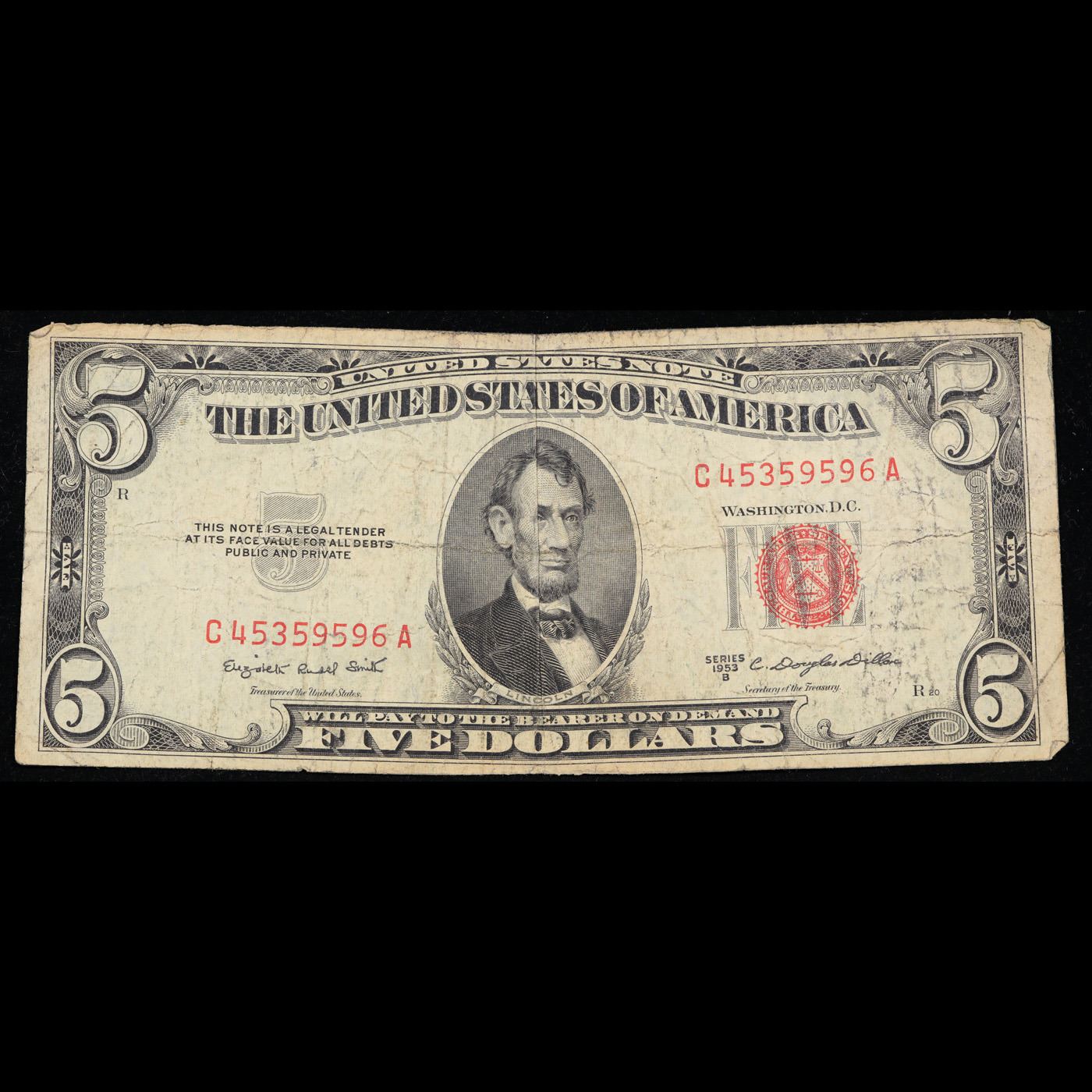 1953B $5 Red Seal United States Note Grades f, fine. 1953 red seal five dollar bills come in four different varieties. Each 1953 five dollar red seal bill has serial number written in red ink. There is a red seal on the right hand side of the bill. All 1953 red seals were printed in Washington DC and feature a portrait of Abraham Lincoln in the center of the bill. You can also find the following wording on each bill, “United States Note, The United States of America, This Note Is A Legal Tender At Its Face Value For All Debts Public And Private, Will Pay To The Bearer On Demand Five Dollars”