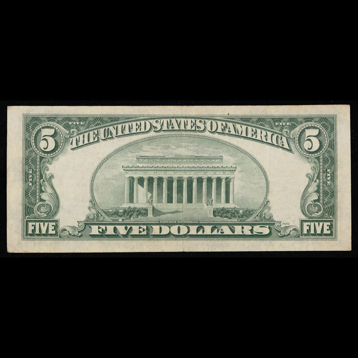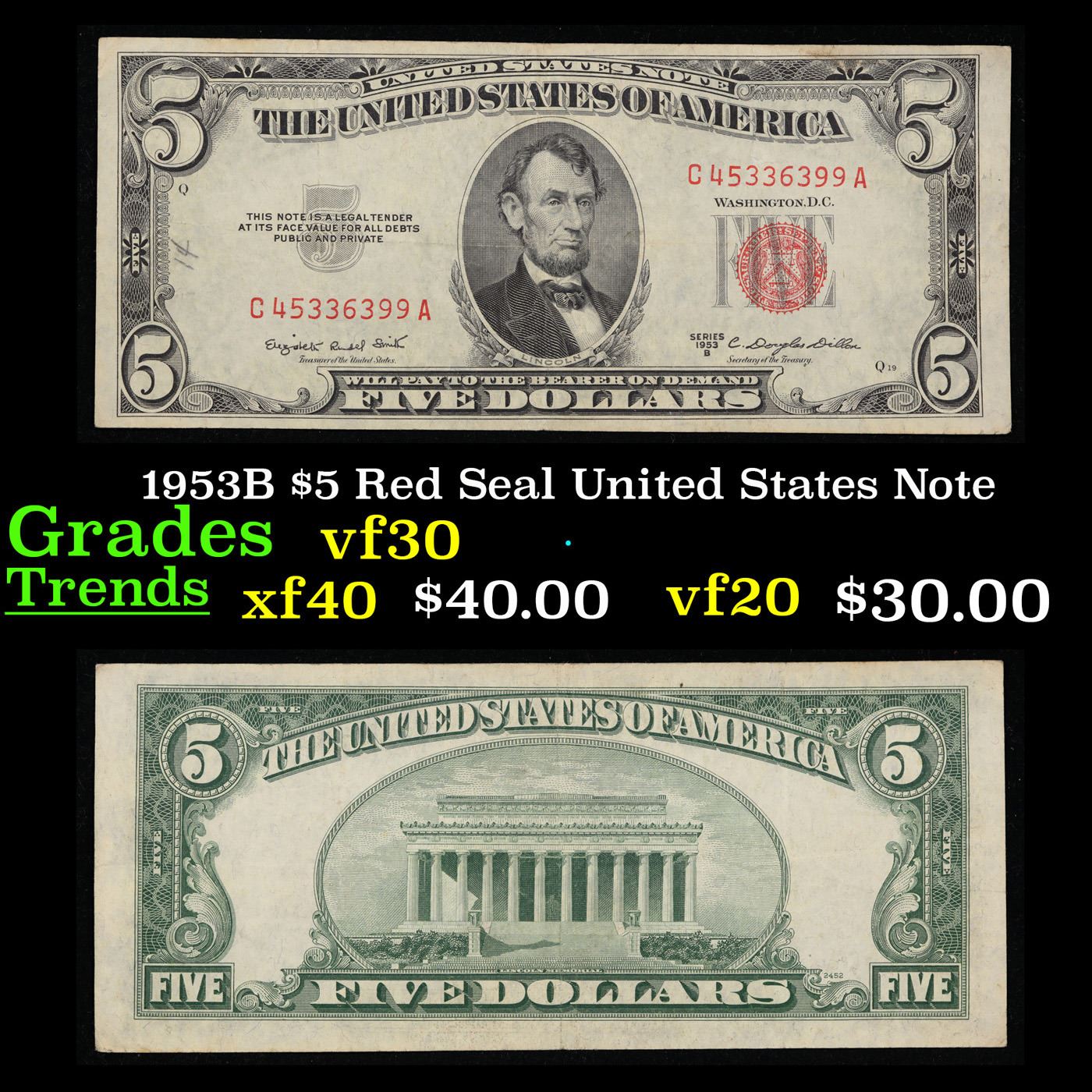 1953B $5 Red Seal United States Note Grades vf++. 1953 red seal five dollar bills come in four different varieties. Each 1953 five dollar red seal bill has serial number written in red ink. There is a red seal on the right hand side of the bill. All 1953 red seals were printed in Washington DC and feature a portrait of Abraham Lincoln in the center of the bill. You can also find the following wording on each bill, “United States Note, The United States of America, This Note Is A Legal Tender At Its Face Value For All Debts Public And Private, Will Pay To The Bearer On Demand Five Dollars”