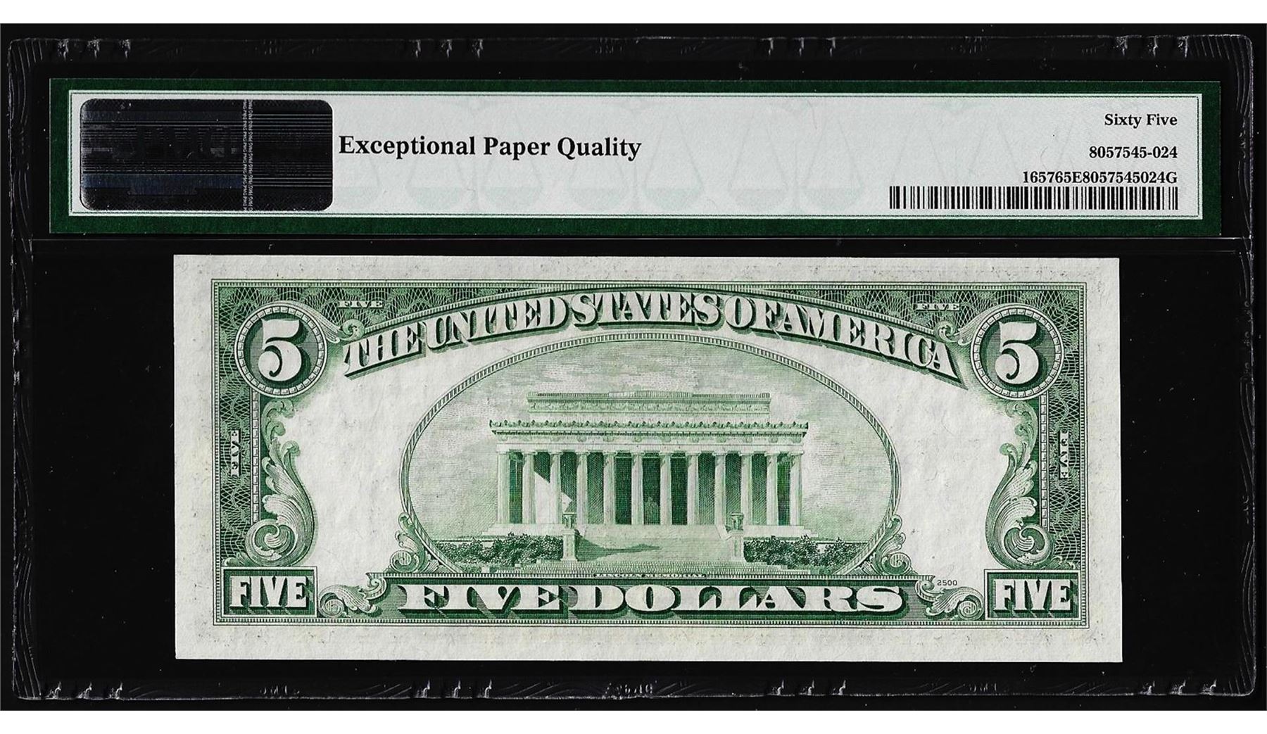 One 1953B $5 Silver Certificate Note Fr.1657 PMG Gem Uncirculated 65EPQ. PMG Certified.